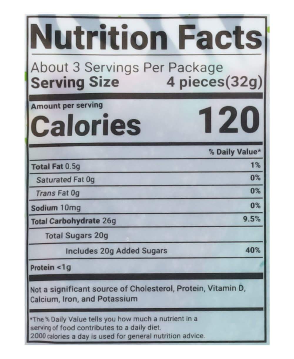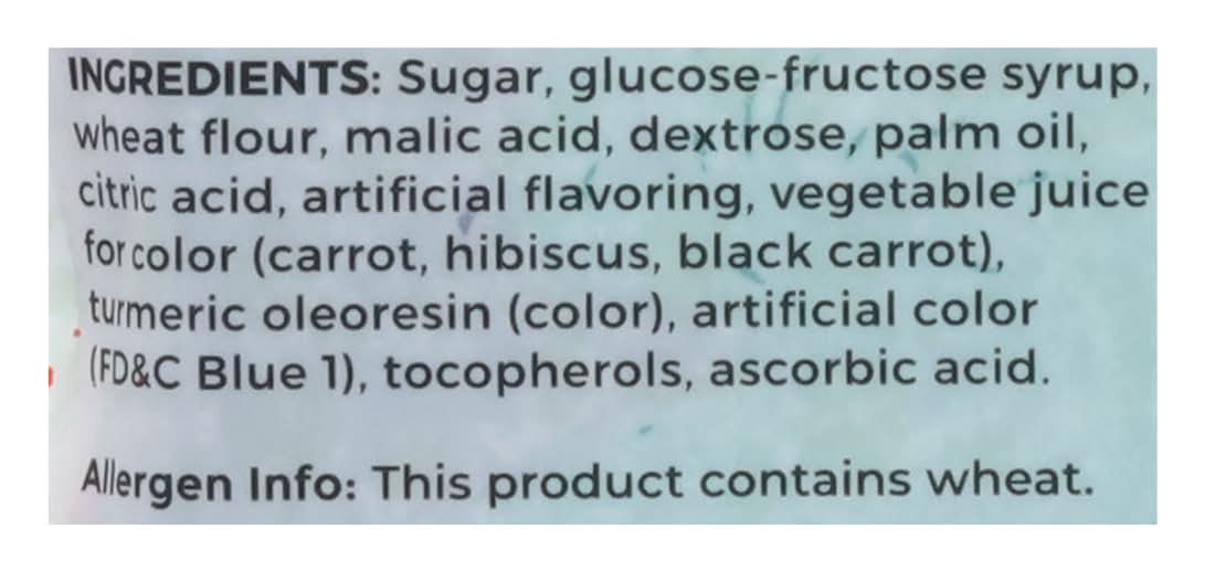Ingredients: Sugar, Glucose-Fructose Syrup, Wheat Flour, Malic Acid, Dextrose, Palm Oil, Citric Acid, Artificial Flavoring, Vegetable Juice for Color (Carrot, Hibiscus, Black Carrot), Turmeric Oleoresin (Color), Artificial Color (FD&C Blue 1), Tocopherols, Ascorbic Acid Contains: Wheat