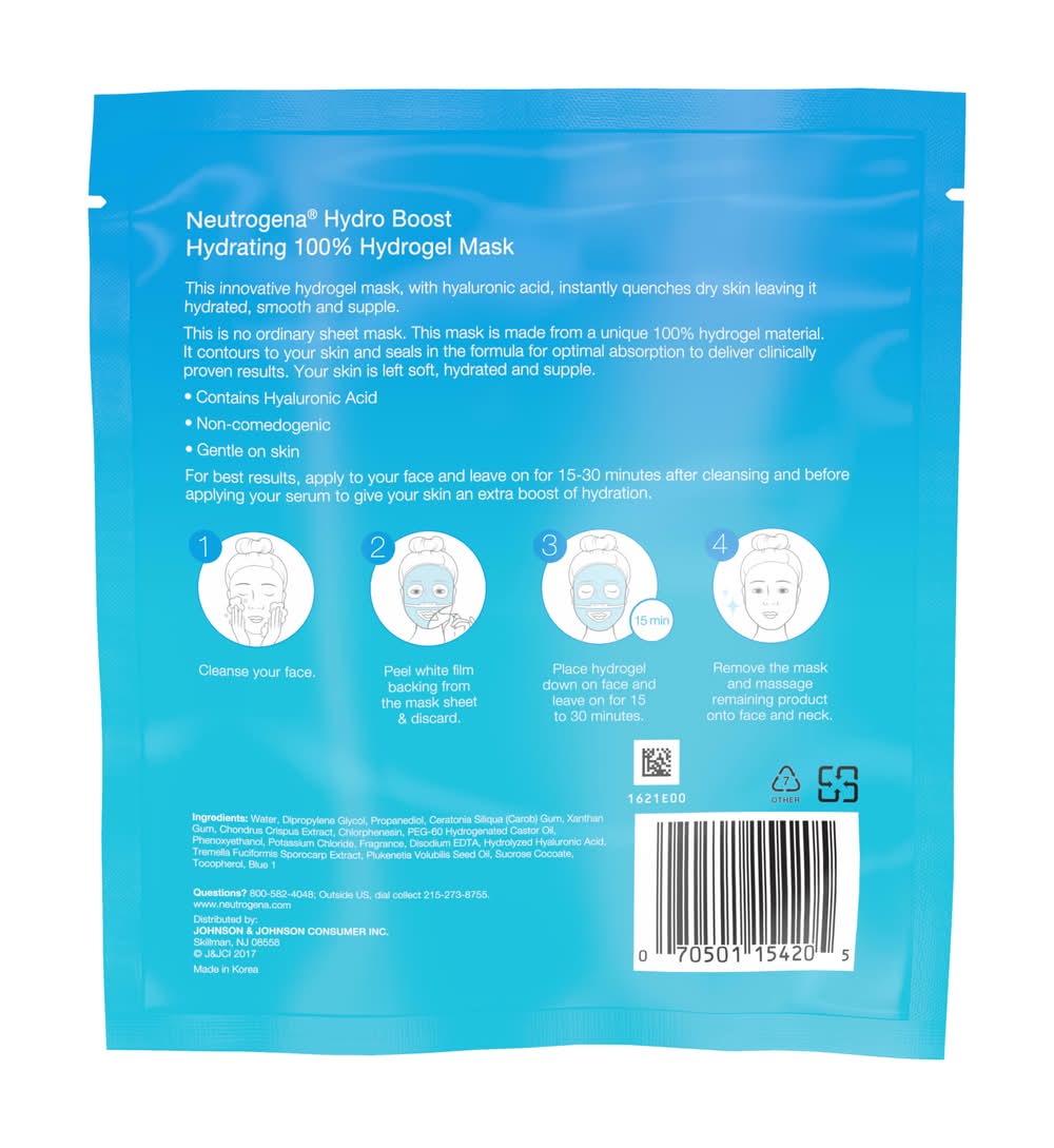New. Hyaluronic acid. Instantly quenches skin. Deeply hydrates. Leaves skin supple and hydrated. Single use masks. This innovative hydrogel mask, with hyaluronic acid, instantly quenches dry skin leaving it hydrated, smooth and supple. This is no ordinary sheet mask. This mask is made from a unique 100% hydrogel material. It contours to your skin and seals in the formula for optimal absorption to deliver clinically proven results. Your skin is left soft, hydrated and supple. Contains hyaluronic acid. • Johnson & Johnson Consumer Inc., Skillman, NJ, 08558 • Packaging: Reusable
