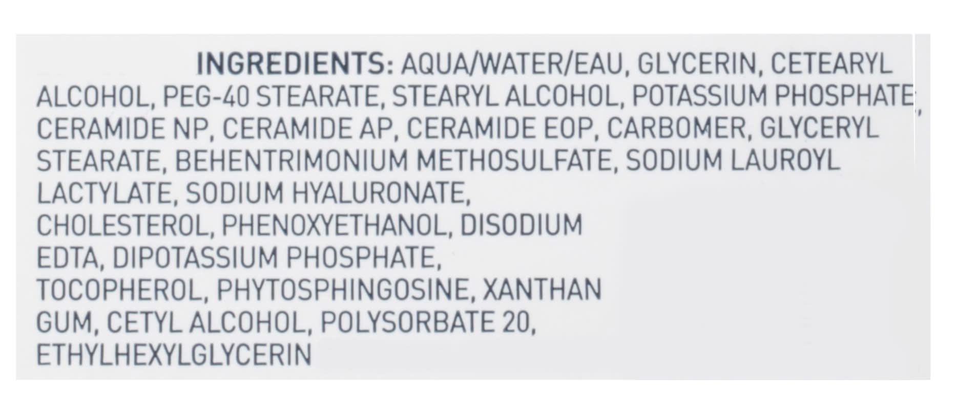 Ingredients: Aqua/Water/Eau, Glycerin, Cetearyl Alcohol, PEG-40 Stearate, Stearyl Alcohol, Potassium Phosphate, Ceramide NP, Ceramide AP, Ceramide EOP, Carbomer, Glyceryl Stearate, Behentrimonium Methosulfate, Sodium Lauroyl Lactylate, Sodium Hyaluronate, Cholesterol, Phenoxyethanol, Disodium EDTA, Dipotassium Phosphate, Tocopherol, Phytosphingosine, Xanthan Gum, Cetyl Alcohol, Polysorbate 20, Ethylhexylglycerin (Code F.I.L. D214633/3)