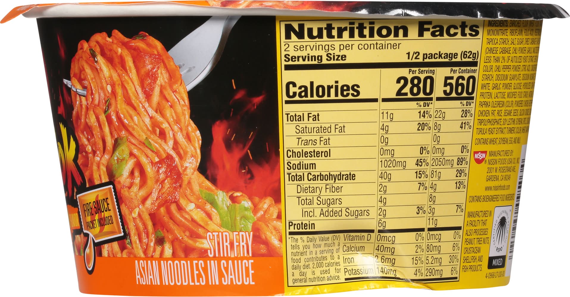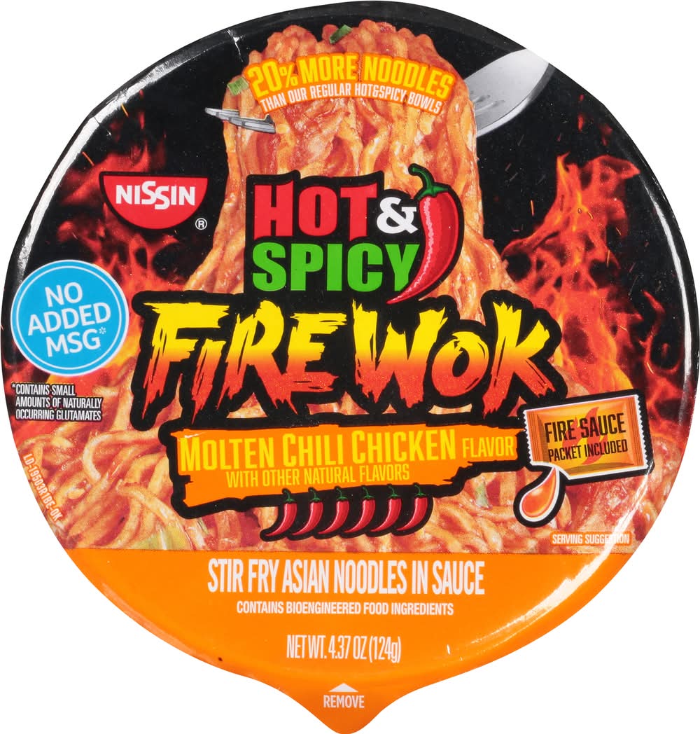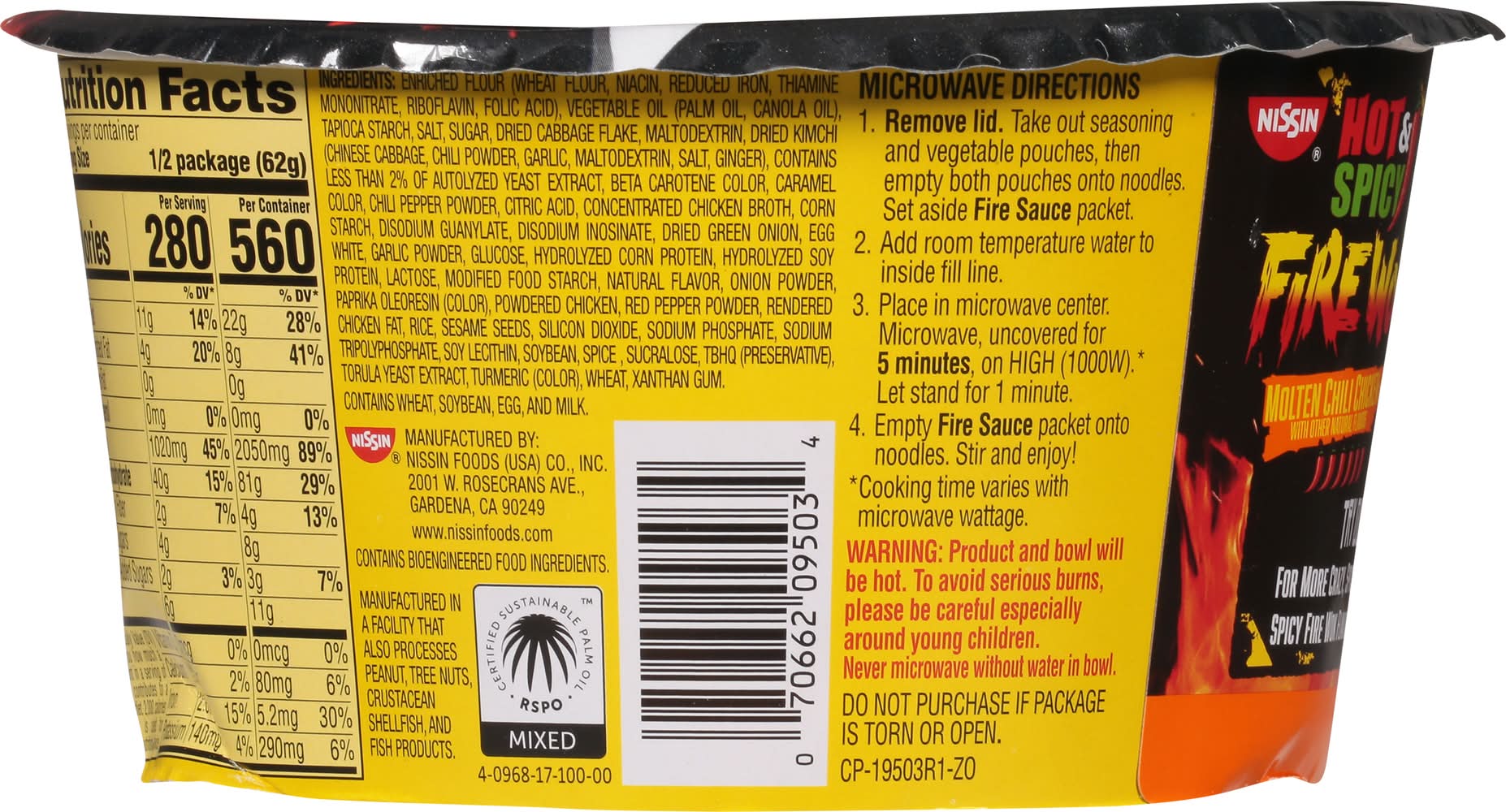 Flavor with other natural flavors. No added MSG (Contains small amounts of naturally occurring glutamates). Fire sauce packet included. Take the challenge! Fiery chicken noodles coated with a spicy yet tangy Korean chili pepper sauce as that builds the heat with every bite. 20% more noodles than our regular hot & spicy bowls. • Flavor: Molten chili chicken • Nissin Foods (USA) Co., Inc., 2001 W. Rosecrans Ave,Gardena,CA,90249
