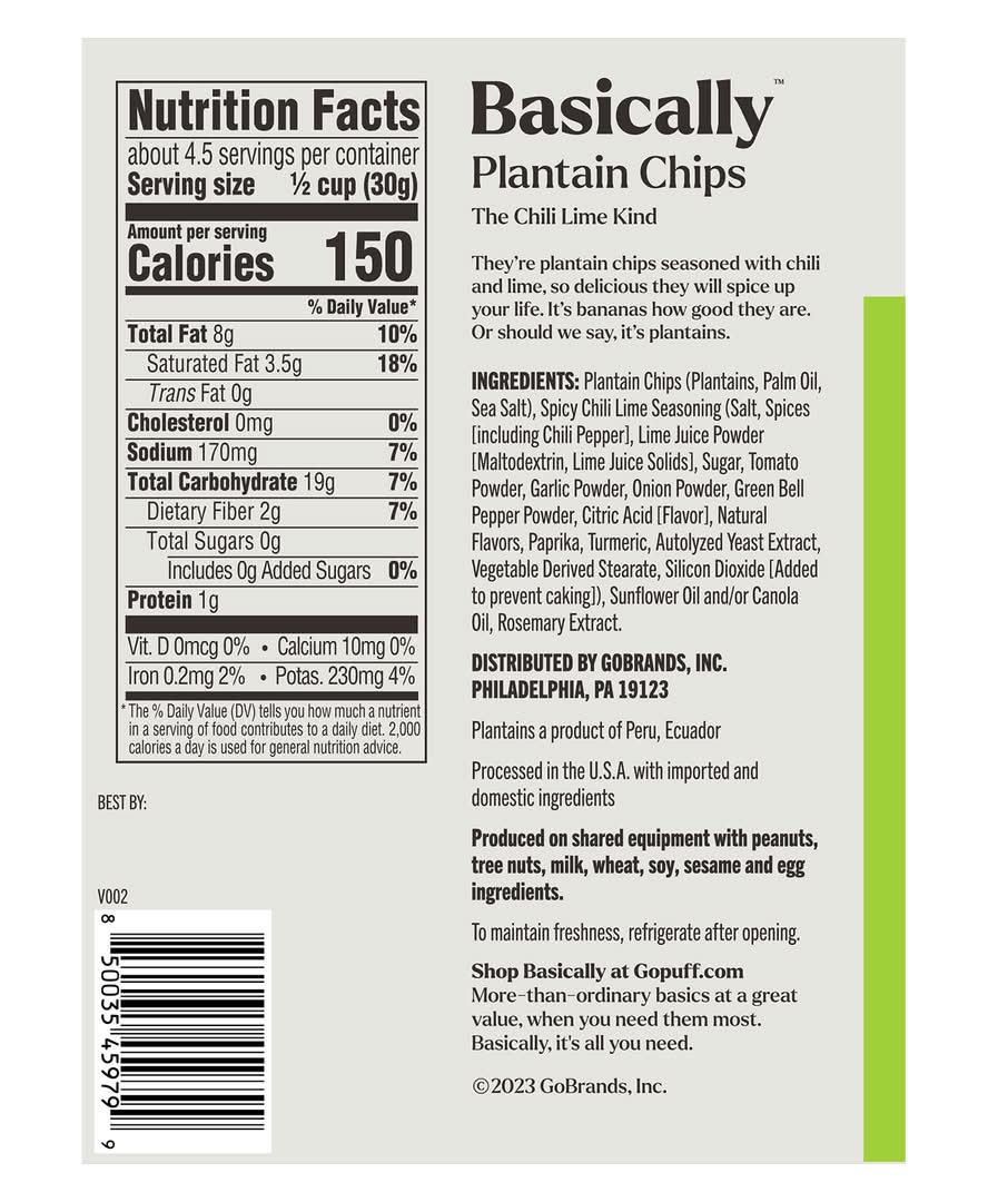 Basically Amazing Chili Lime Plantain Chips come in a resealable pouch, ensuring freshness with every bite. Each plantain chip is thinly sliced and kettle cooked, giving it a crispy texture. These chips are seasoned with chili and lime for a vibrant flavor. They are free from synthetic flavors, colors, and preservatives, and contain no added sulfites. Please note that these chips may contain peanuts, tree nuts, milk, wheat, soy, sesame, and egg. They are non-GMO and certified Kosher.
