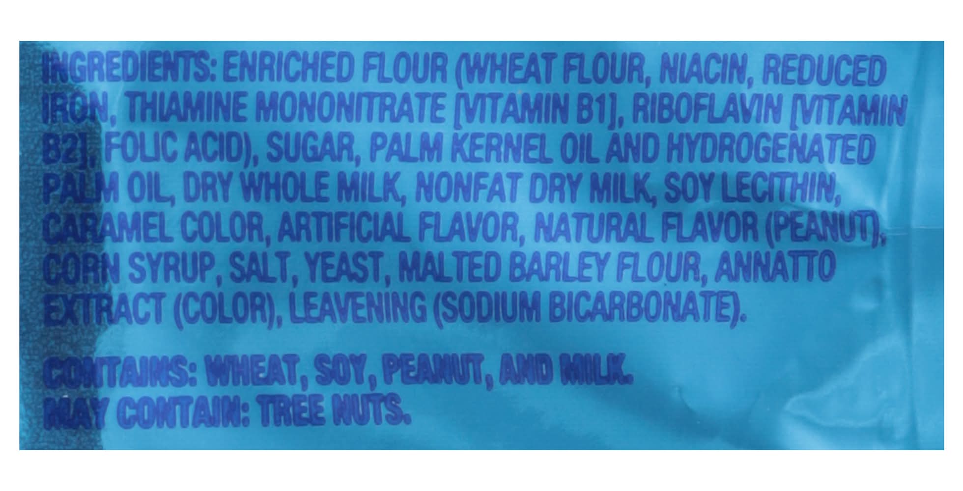 Ingredients: Enriched Flour (Wheat Flour, Niacin, Reduced Iron, Thiamine Mononitrate [Vitamin B1]), Riboflavin [Vitamin 82) Folic Acid), Sugar, Palm Kernel Oil and Hydrogenated Palm Oil, Dry Whole Milk, Nonfat Dry Milk, Soy Lecithin, Caramel Color, Artificial Flavor, Natural Flavor (Peanut Corn Syrup, Salt, Yeast, Malted Barley Flour, Annatto Extract (Color), Leavening (Sodium Bicarbonate) Contains: Wheat, Soybeans, Peanuts, Milk, Corn, Barley, Tree Nuts