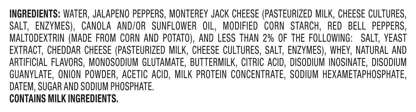 Ingredients: Water, Jalapeno Peppers, Monterey Jack Cheese (Pasteurized Milk, Cheese Cultures, Salt, Enzymes), Canola and/or Sunflower Oil, Modified Corn Starch, Red Bell Peppers, Maltodextrin (Made from Corn and Potato), and Less than 2% of the Following: Salt, Yeast Extract, Cheddar Cheese (Pasteurized Milk, Cheese Cultures, Salt, Enzymes), Whey, Natural and Artificial Flavors, Monosodium Glutamate, Buttermilk, Citric Acid, Disodium Inosinate, Disodium Guanylate, Onion Powder, Acetic Acid, Milk Protein Concentrate, Sodium Hexametaphosphate, DATEM, Sugar and Sodium Phosphate Contains: Milk