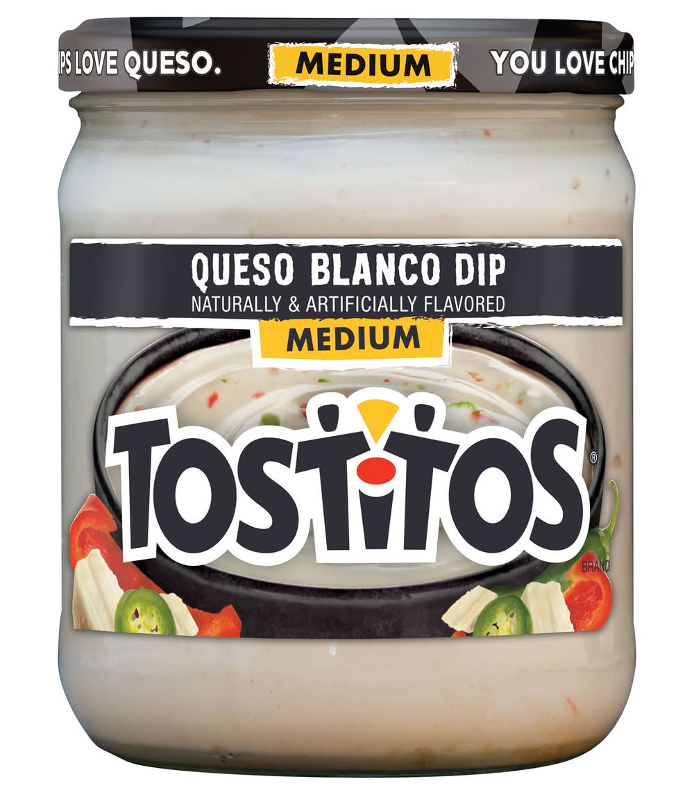 Tostitos Queso Blanco Dip contains creamy Monterey jack cheese, spicy jalapeños and mild red bell peppers for the perfect level of heat. Made with real Monterey jack & cheddar, it's a deliciously satisfying snack. It can be enjoyed cold or warm. To heat it up transfer the dip to a microwavable container. Microwave for 30 seconds then stir. Repeat until desired temperature is reached. • Flavor: Queso blanco • Frito Lay, Plano, TX 75024-4099