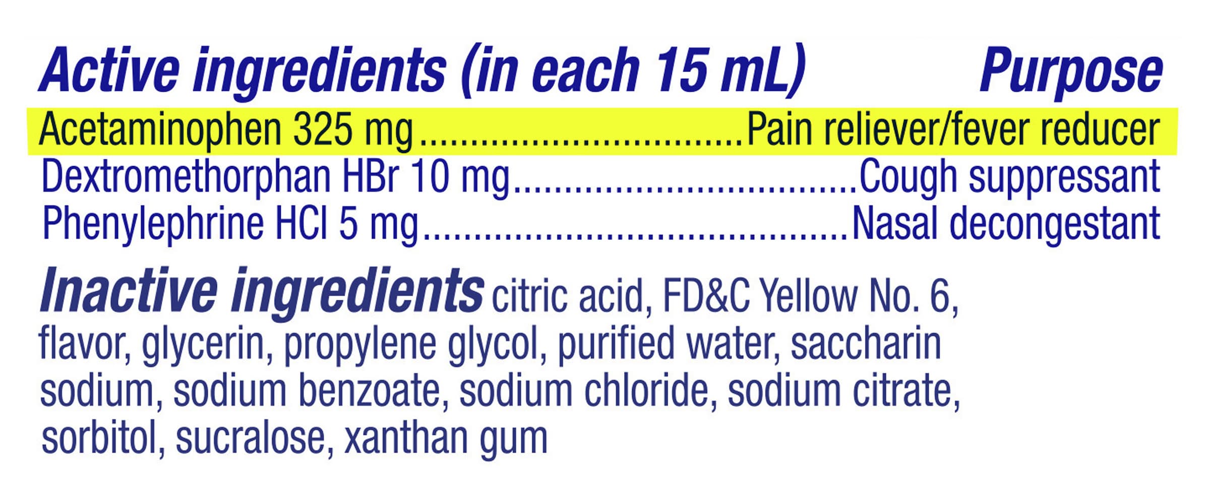 Ingredients: (In Each 15 ml): Active Ingredients: Acetaminophen (325 mg), Pain Reliever/Fever Reducer; Dextromethorphan HBr (10 mg), Cough Suppressant; Phenylephrine HCI (5 mg), Nasal Decongestant. Inactive Ingredients: Citric Acid, FD&C Yellow 6, Flavor, Glycerin, Propylene Glycol, Purified Water, Saccharin Sodium, Sodium Benzoate, Sodium Chloride, Sodium Citrate, Sorbitol, Sucralose, Xanthan Gum