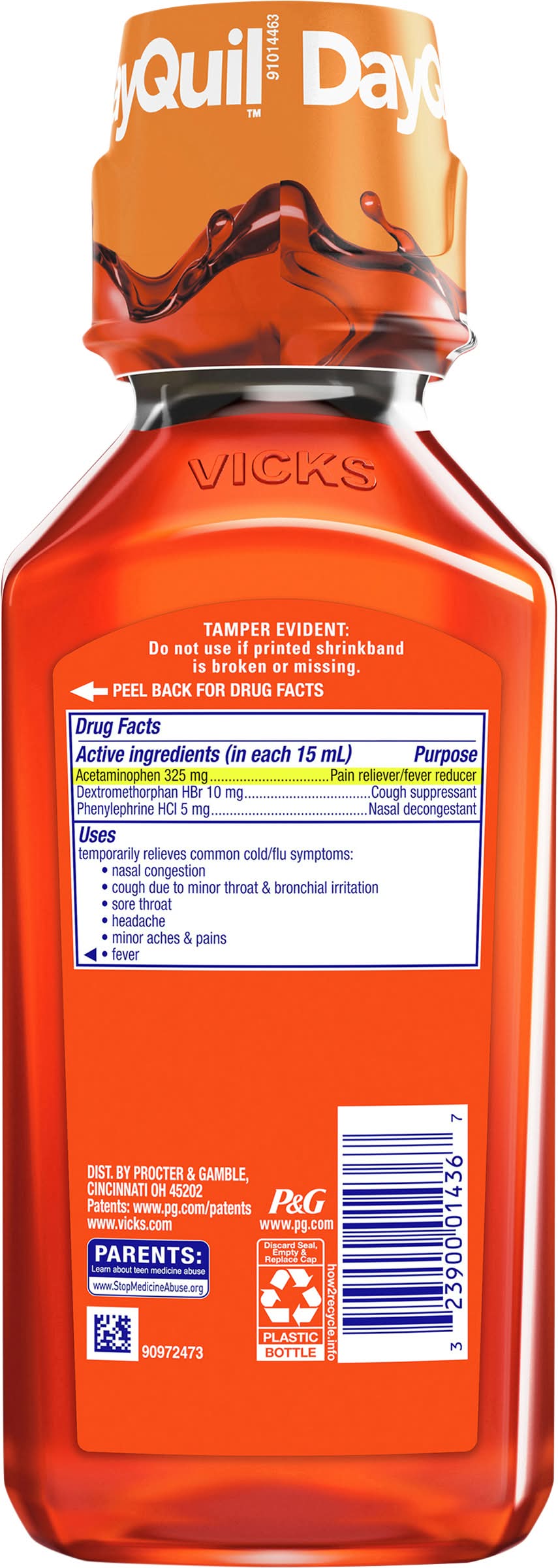 From the world's #1 selling OTC cough and cold brand†, Vicks DayQuil Cold & Flu liquid provides powerful relief for your worst cold and flu symptoms. Vicks DayQuil over-the-counter medicine comes in a non-drowsy formula so you can get on with your day. When you need fast relief, this powerful, daytime multi-symptom relief medicine treats headache, fever, sore throat, minor aches and pains, nasal congestion, sinus pressure, and cough due to minor throat and bronchial irritation. Nothing works faster. Vicks has been trusted for over 125 years to relieve your cold and flu symptoms. DayQuil is the #1 pharmacist recommended daytime cough, cold & flu brand* Active ingredients per 30 mL dose for adults are acetaminophen 650 mg (pain reliever/fever reducer), dextromethorphan HBr 20 mg (cough suppressant), and phenylephrine HCI 10 mg (nasal decongestant). Store at room temperature; do not refrigerate. Take only as directed. Use only the dose cup provided. Do not exceed 4 doses per 24 hours. Adults and children 12 years and over take 30 mL every 4 hours. *2022 Pharmacy Times Survey of Pharmacists OTC Recommendations † Nicholas Hall’s global CHC sales database, DB20 • Procter & gamble, Cincinnati,OH,45202 • Packaging: Reusable