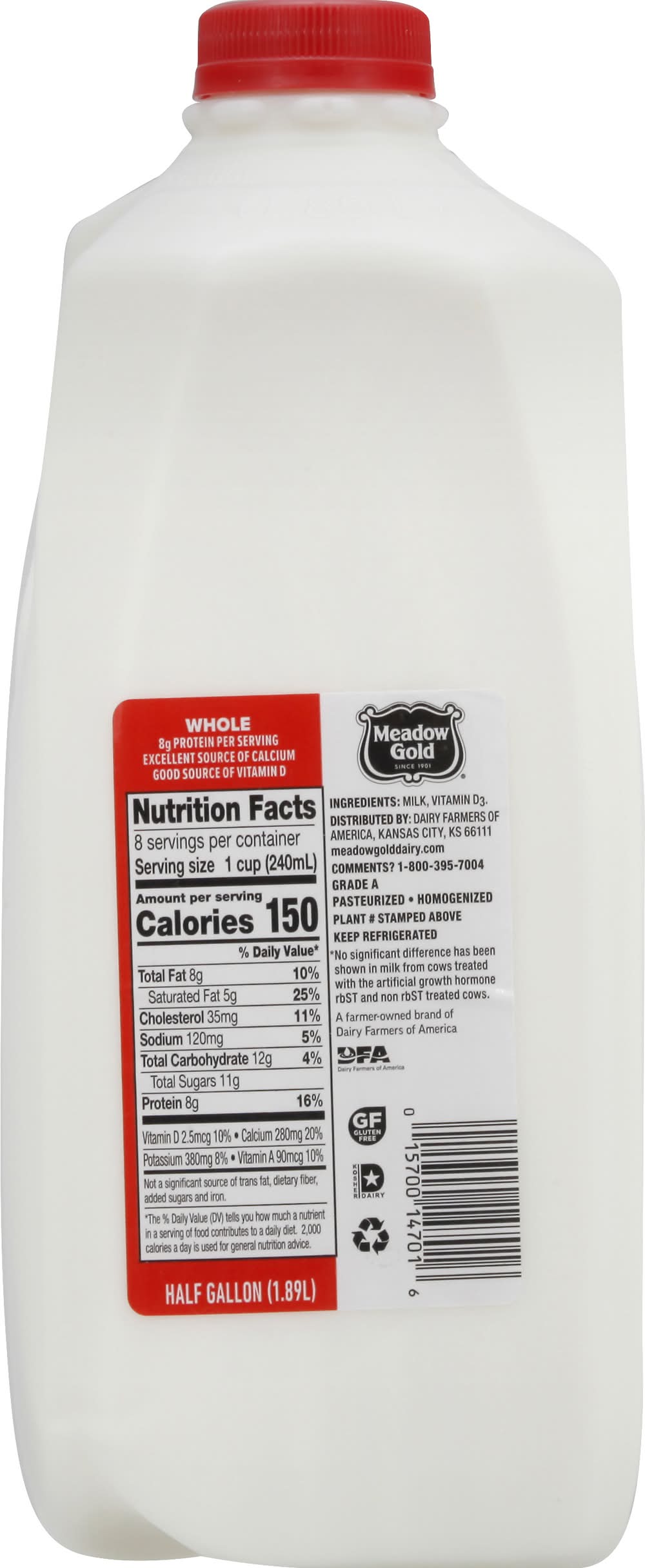 Whole Milk is a pasteurized and homogenized dairy product that provides 8 grams of protein per serving. It is a rich source of Vitamin D and calcium, and also contains Vitamin A. The milk is produced by Dairy Farmers of America, a farmer-owned brand with a heritage dating back to 1901. It adheres to a pledge by the farmers not to use artificial growth hormones, noting that no significant difference has been shown in milk from cows treated with the hormone rBST and those not treated. This product is classified as Grade A and is gluten-free. • Dairy Farmers of America, Kansas City, KS, 66111 • Packaging: Reusable