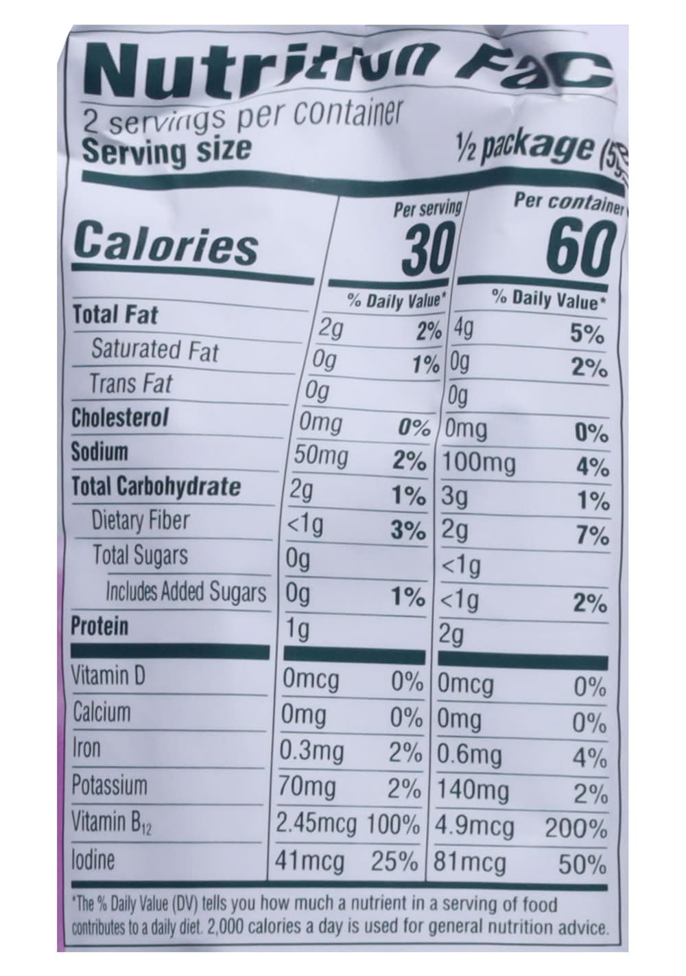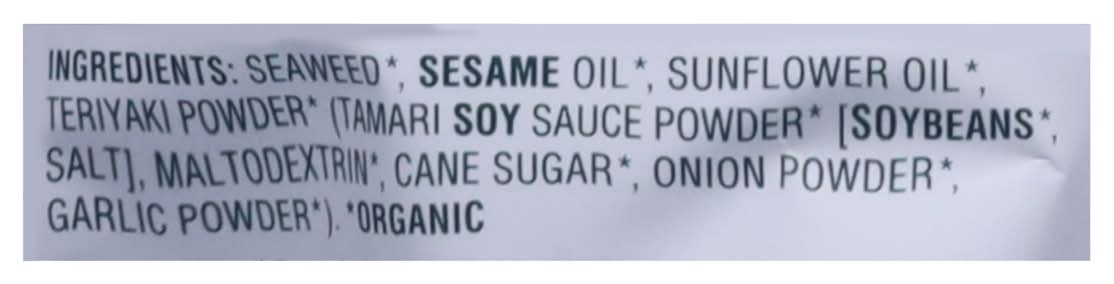 Ingredients: Seaweed*, Sesame Oil*, Sunflower Oil*, Teriyaki Powder* (Tamari Soy Sauce Powder* [Soybeans*, Salt], Maltodextrin*, Cane Sugar*, Onion Powder*, Garlic Powder*). * Organic Contains: Sesame, Soybeans