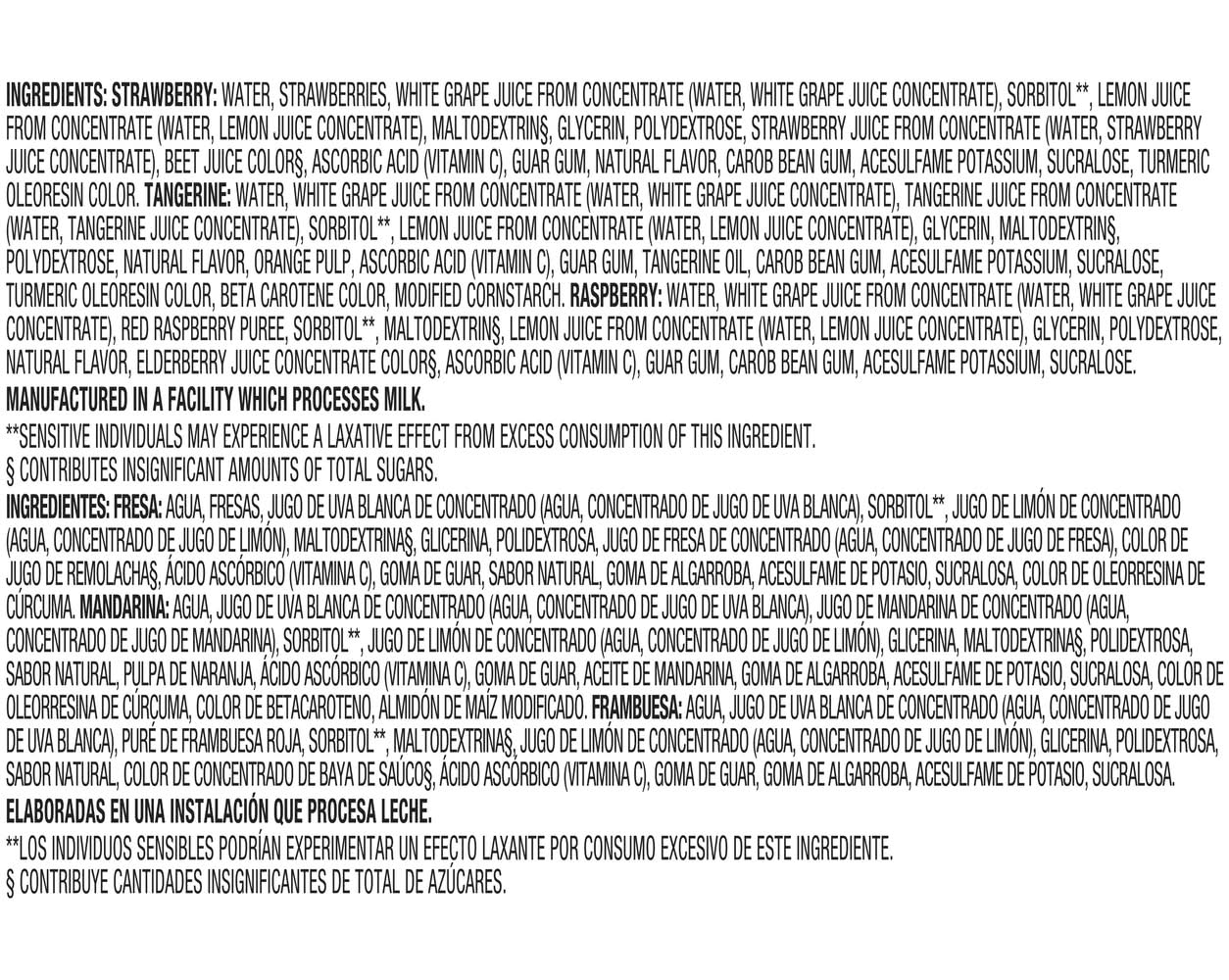 Ingredients: STRAWBERRY: WATER, STRAWBERRIES, WHITE GRAPE JUICE FROM CONCENTRATE (WATER, WHITE GRAPE JUICE CONCENTRATE), SORBITOL**, LEMON JUICE FROM CONCENTRATE (WATER, LEMON JUICE CONCENTRATE), MALTODEXTRIN§, GLYCERIN, POLYDEXTROSE, STRAWBERRY JUICE FROM CONCENTRATE (WATER, STRAWBERRY JUICE CONCENTRATE), BEET JUICE COLOR§, ASCORBIC ACID (VITAMIN C), GUAR GUM, NATURAL FLAVOR, CAROB BEAN GUM, ACESULFAME POTASSIUM, SUCRALOSE, TURMERIC OLEORESIN COLOR. TANGERINE: WATER, WHITE GRAPE JUICE FROM CONCENTRATE (WATER, WHITE GRAPE JUICE CONCENTRATE), TANGERINE JUICE FROM CONCENTRATE (WATER, TANGERINE JUICE CONCENTRATE), SORBITOL**, LEMON JUICE FROM CONCENTRATE (WATER, LEMON JUICE CONCENTRATE), GLYCERIN, MALTODEXTRIN§, POLYDEXTROSE, NATURAL FLAVOR, ORANGE PULP, ASCORBIC ACID (VITAMIN C), GUAR GUM, TANGERINE OIL, CAROB BEAN GUM, ACESULFAME POTASSIUM, SUCRALOSE, TURMERIC OLEORESIN COLOR, BETA CAROTENE COLOR, MODIFIED CORNSTARCH. RASPBERRY: WATER, WHITE GRAPE JUICE FROM CONCENTRATE (WATER, WHITE GRAPE JUICE CONCENTRATE), RED RASPBERRY PUREE, SORBITOL**, MALTODEXTRIN§, LEMON JUICE FROM CONCENTRATE (WATER, LEMON JUICE CONCENTRATE), GLYCERIN, POLYDEXTROSE, NATURAL FLAVOR, ELDERBERRY JUICE CONCENTRATE COLOR§, ASCORBIC ACID (VITAMIN C), GUAR GUM, CAROB BEAN GUM, ACESULFAME POTASSIUM, SUCRALOSE. Contains: MANUFACTURED IN A FACILITY WHICH ALSO PROCESSES MILK.