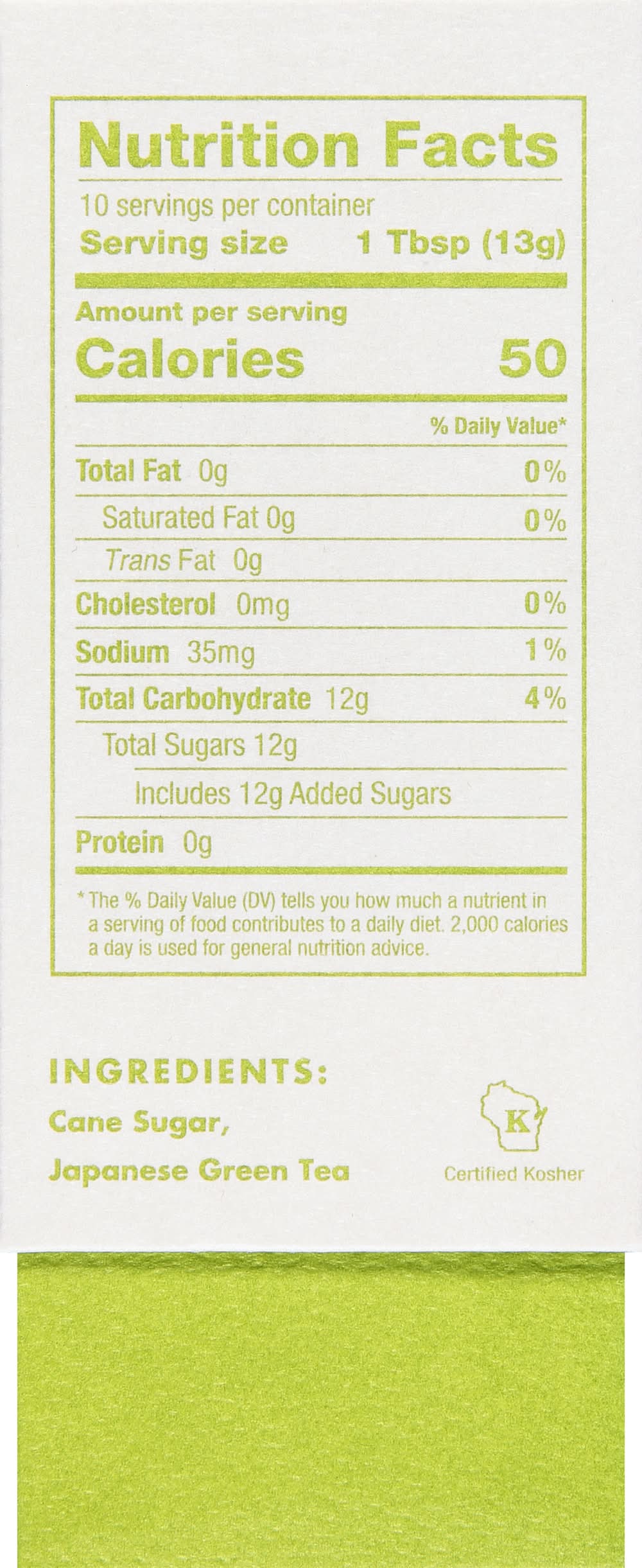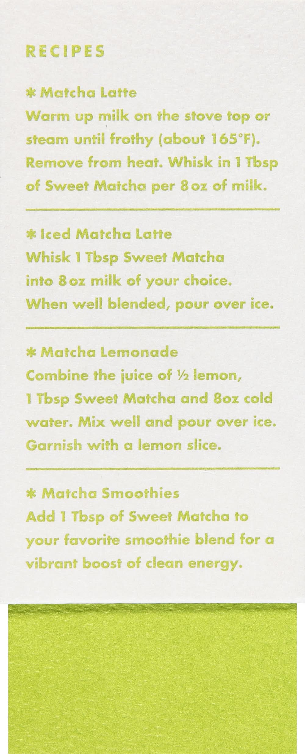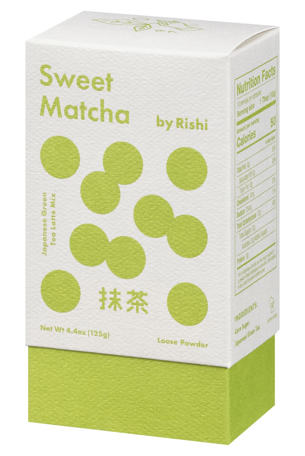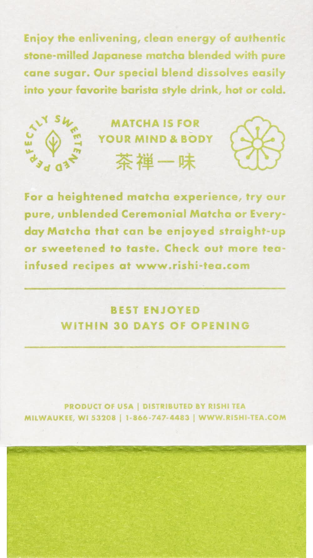 Japanese Green Tea Latte Mix, Sweet Matcha, Loose Powder • Number of servings: 10 • RISHI TEA, Milwaukee, WI, 53208, Ph: 866-747-4483 • Packaging: Reusable