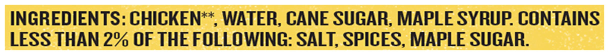 Ingredients: Chicken**, Water, Cane Sugar, Maple Syrup, Contains Less than 2% of the Following: Salt, Spices, Maple Sugar. ** Chicken Never Administered Antibiotics, Added Growth Hormones, or Fed Animal By-Products, Federal Regulations Prohibit the Use of Added Hormones in Poultry