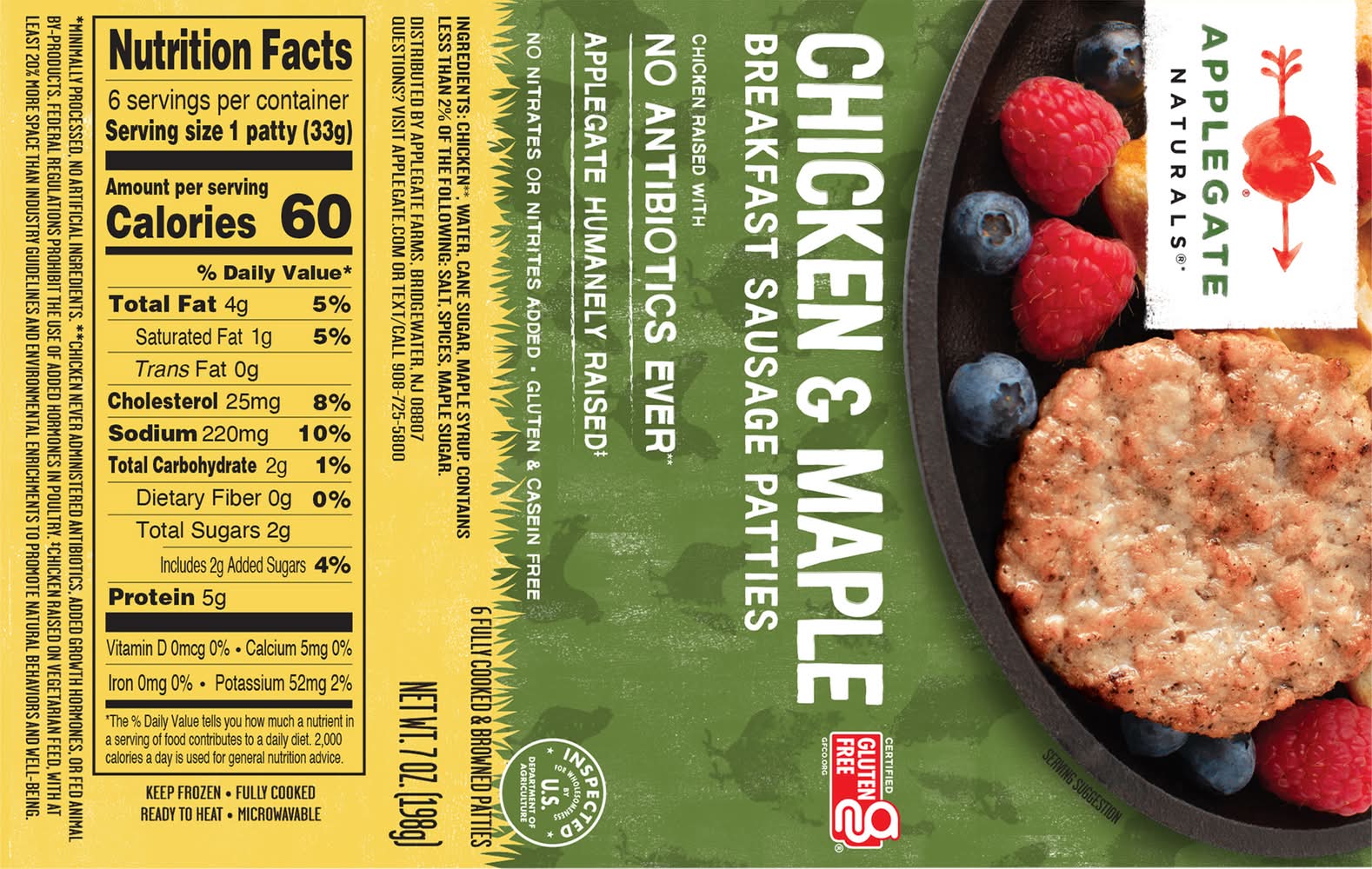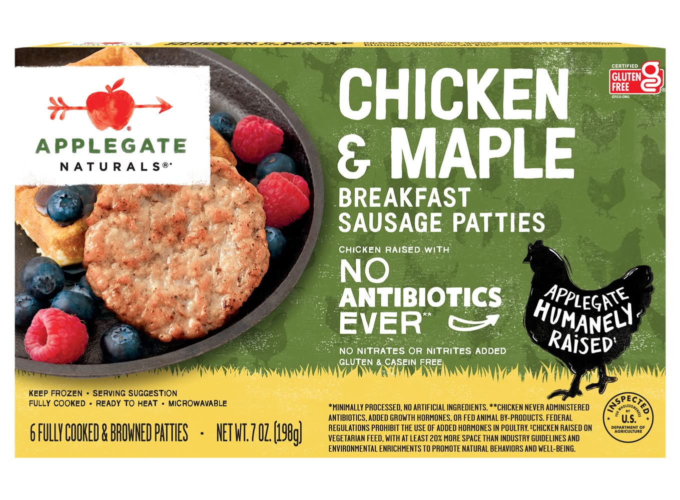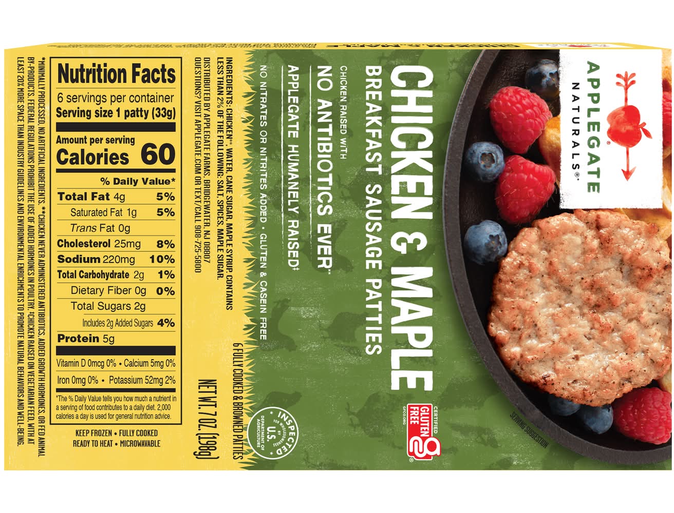 Instantly satisfy your pancake craving with Applegate Natural Chicken & Maple Breakfast Sausage Patties. These frozen sausage patties are pre-cooked and ready to heat for a breakfast you'll never forget Applegate Farms, Bridgewater-NJ-08807