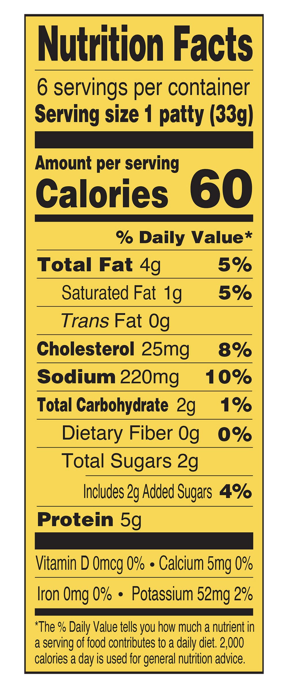Directions for use: Skillet (Preferred): Place frozen patties in a preheated skillet over medium heat. Turning them occasionally, about 4-5 minutes. Place patties on a paper towel on a microwave-safe plate. Do not cover. Set microwave to medium heat (high heat toughens patties). Heat as follows: 1 patty: 1-1/2 min; 2 patties: 2-1/2 min; 4 patties: 4 min; 6 patties: 5-1/2 min. Keep frozen Storage recommendation: Keep frozen.