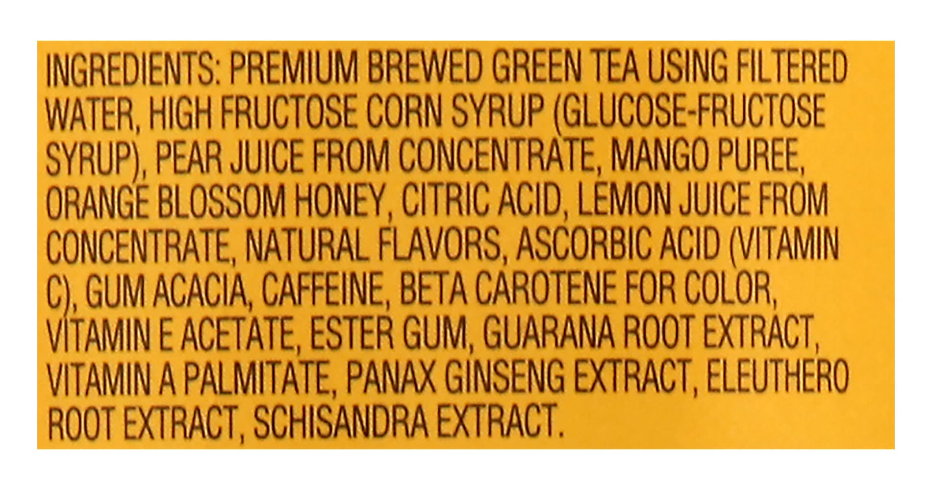 Ingredients: Premium Brewed Green Tea Using Filtered Water, High Fructose Corn Syrup (Glucose-Fructose Syrup), Pear Juice from Concentrate, Mango Puree, Orange Blossom Honey, Citric Acid, Lemon Juice from Concentrate, Natural Flavors, Ascorbic Acid (Vitamin C), Gum Acacia, Caffeine, Beta Carotene for Color, Vitamin E Acetate, Ester Gum, Guarana Root Extract, Vitamin A Palmitate, Panax Ginseng Extract, Eleuthero Root Extract, Schisandra Extract