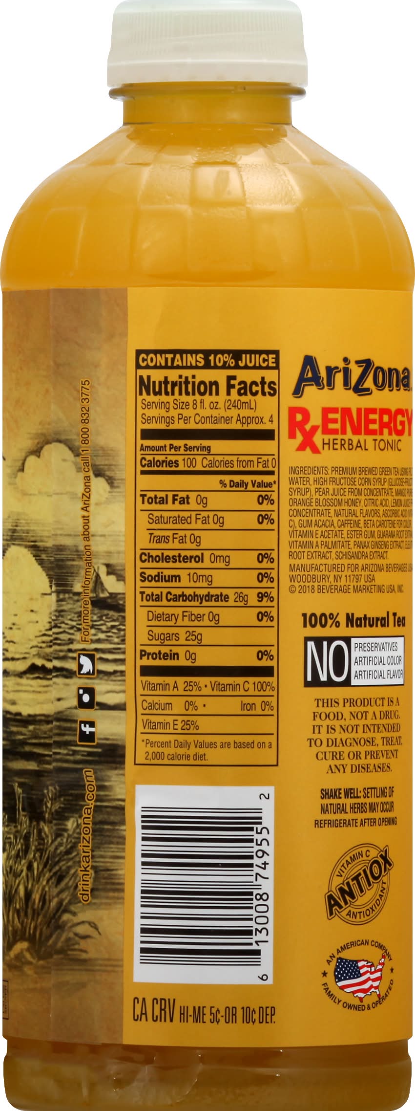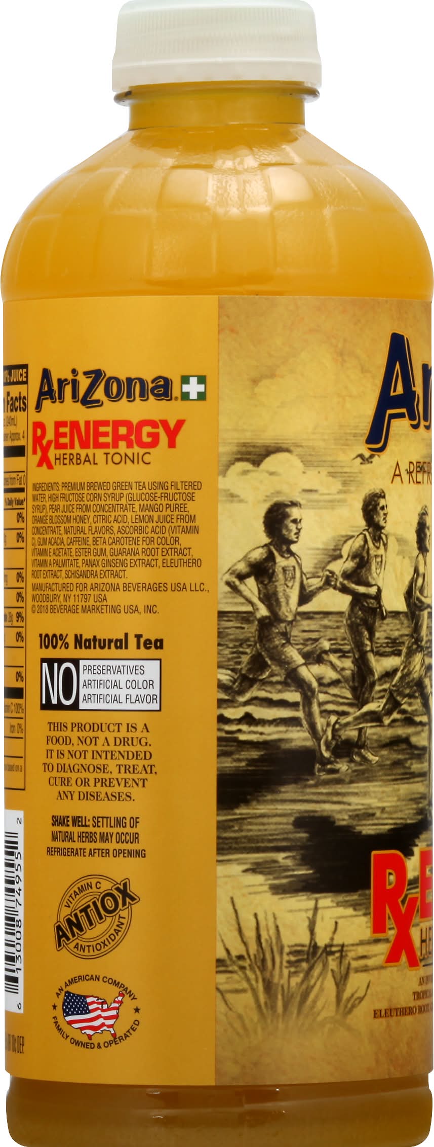 Herbal Tonic, RX Energy • Number of servings: 4 • ARIZONA BEVERAGES USA, Woodbury, NY, 11797, Ph: 800-832-3775. • Packaging: Reusable