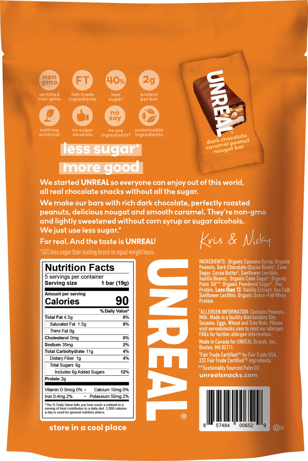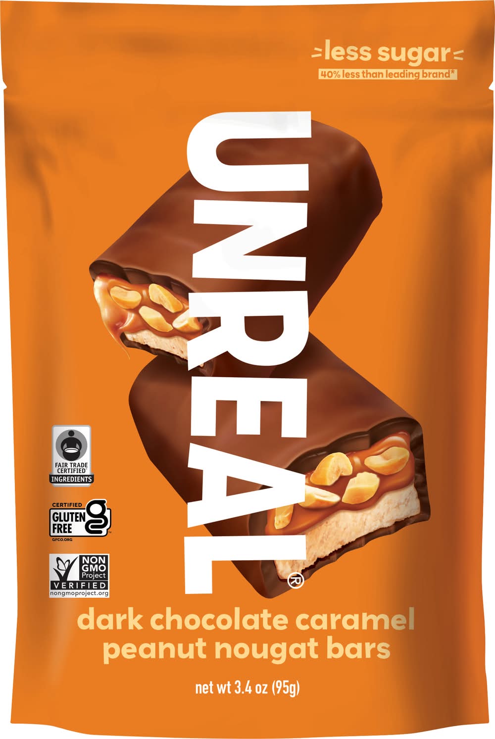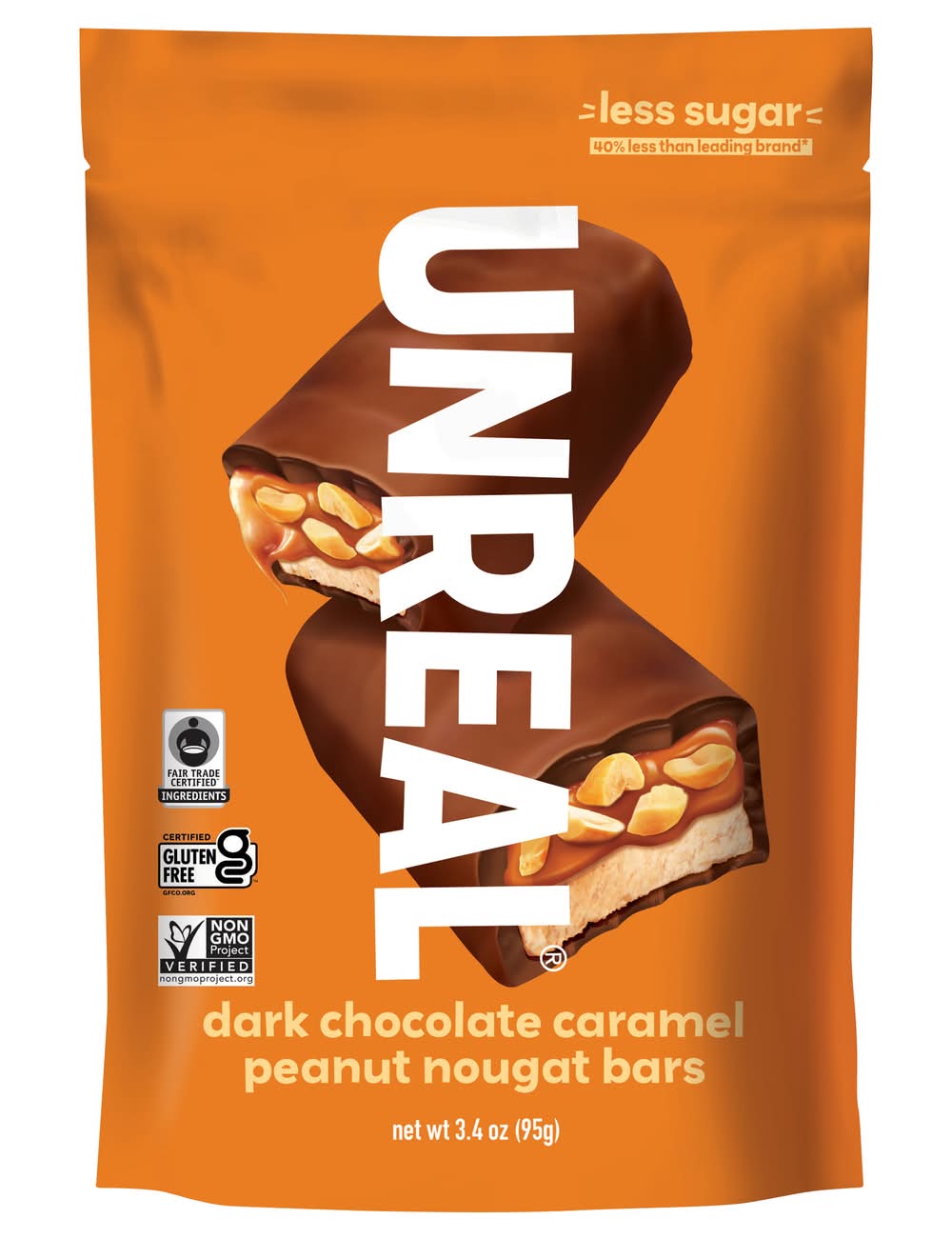 Stop hiding your snacks. Munch them proud. Unreal Dark Chocolate Caramel Peanut Nougat Bars not only have 40% less sugar than the leading brand, it packs a punch of over 70% organic ingredients. Flavor: Dark chocolate caramel peanut nougat