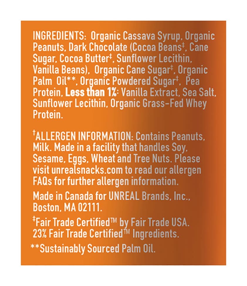 Ingredients: Organic Cassava Syrup, Organic Peanuts, Dark Chocolate (Cocoa Beans(b), Cane Sugar, Cocoa Butter(b), Sunflower Lecithin, Vanilla Beans), Organic Cane Sugar(b), Organic Palm Oil**, Organic Powdered Sugar(b), Pea Protein, Less than 1%: Vanilla Extract, Sea Salt, Sunflower Lecithin, Organic Grass-Fed Whey Protein. (b) Fair Trade Certified by Fair Trade USA. 23% Fair Trade Certified Ingredients. ** Sustainably Sourced Palm Oil Contains: Peanuts, Milk, Soybeans, Sesame, Eggs, Wheat, Tree Nuts