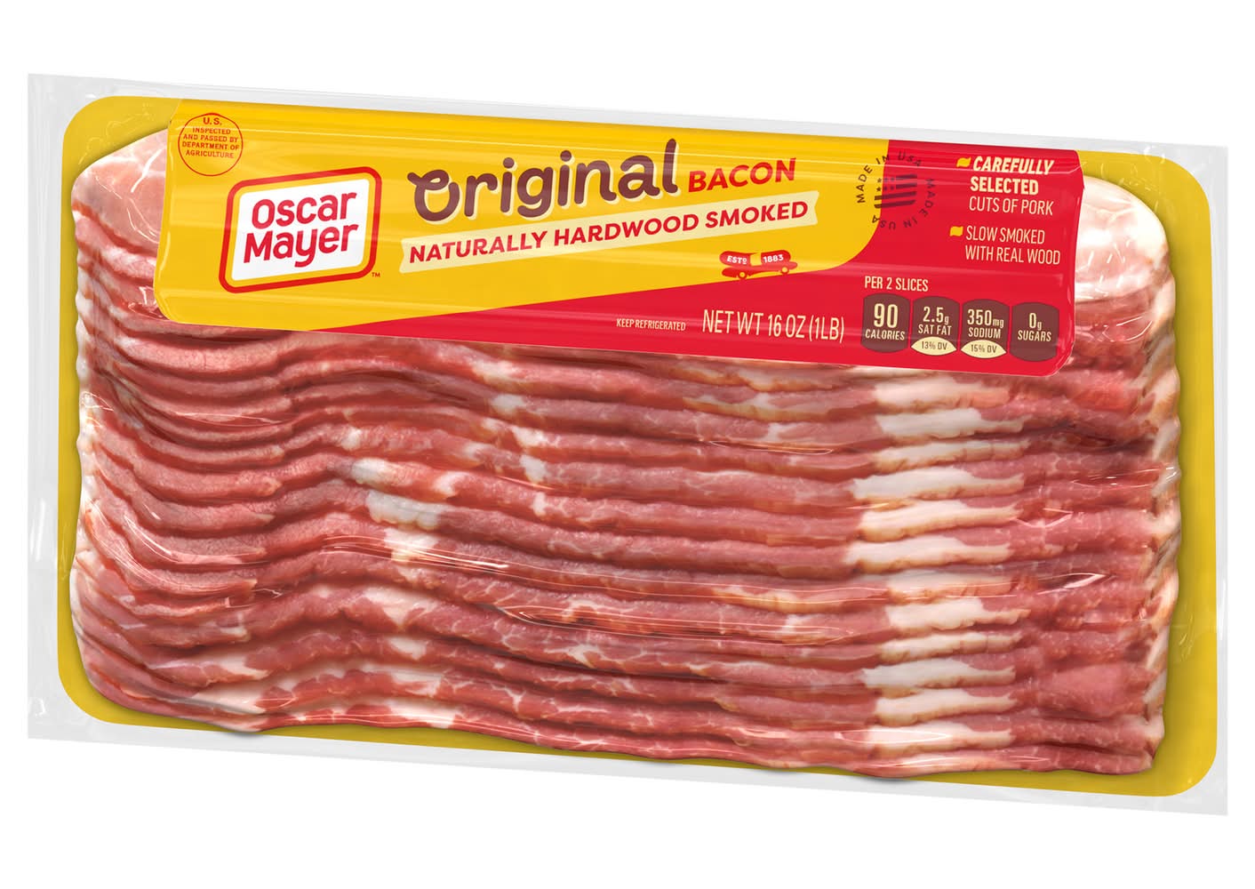 Everything is better with bacon. Oscar Mayer Naturally Hardwood Smoked Bacon Slices deliver smoky bacon flavor that crisps up in minutes. Naturally smoked with real wood for a premium and delicious flavor, our bacon is made from carefully selected, hand-trimmed cuts of pork. Try using our naturally smoked Oscar Mayer bacon as part of a delicious breakfast of bacon and eggs, or to top your favorite dishes like salads and baked potatoes. Kraft Heinz Foods Company, Chicago,IL,60601