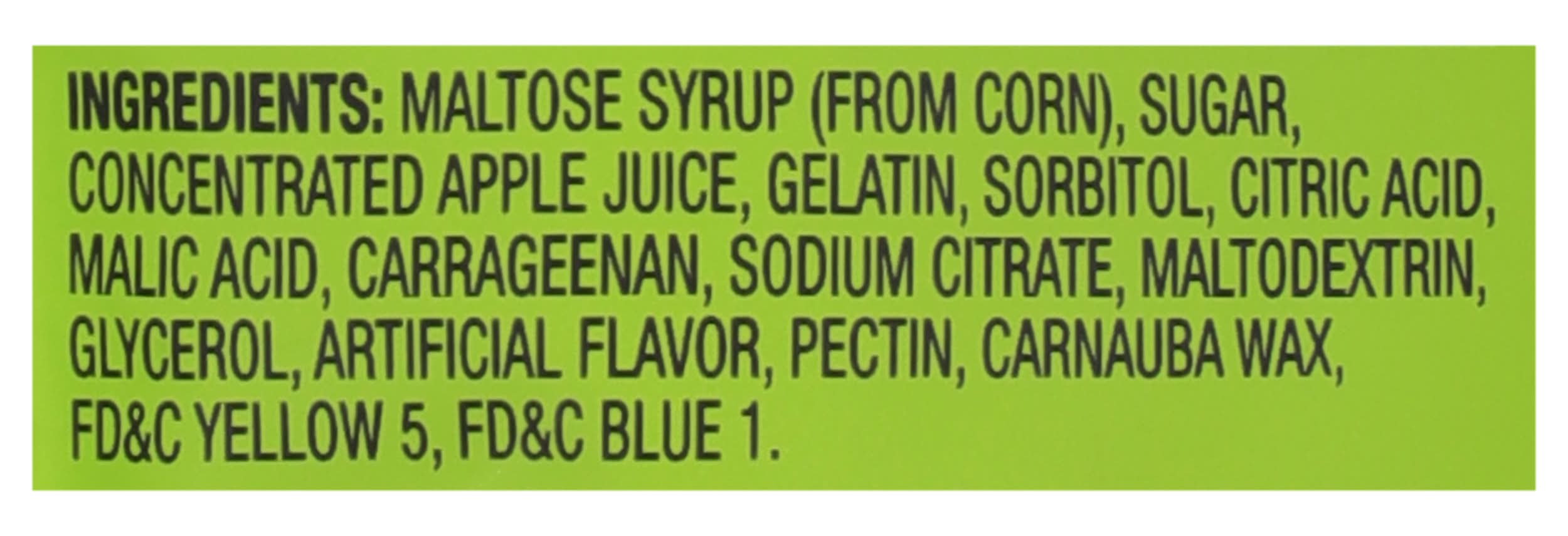 Ingredients: Maltose Syrup (from Corn), Sugar, Concentrated Apple Juice, Gelatin, Sorbitol, Citric Acid, Malic Acid, Carrageenan, Sodium Citrate, Maltodextrin, Glycerol, Artificial Flavor, Pectin, Carnauba Wax, FD&C Yellow 5, FD&C Blue 1