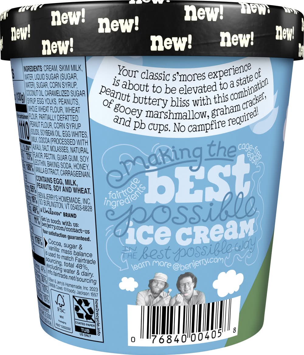 Toasted marshmallow ice cream with peanut butter cups, graham cracker pieces & marshmallow swirls. 370 Calories per 2/3 cup. New! Vermont's finest. Your classic s'mores experience is about to be elevated to a state of peanut buttery bliss with this combination of gooey marshmallow, graham cracker, and pb cups.