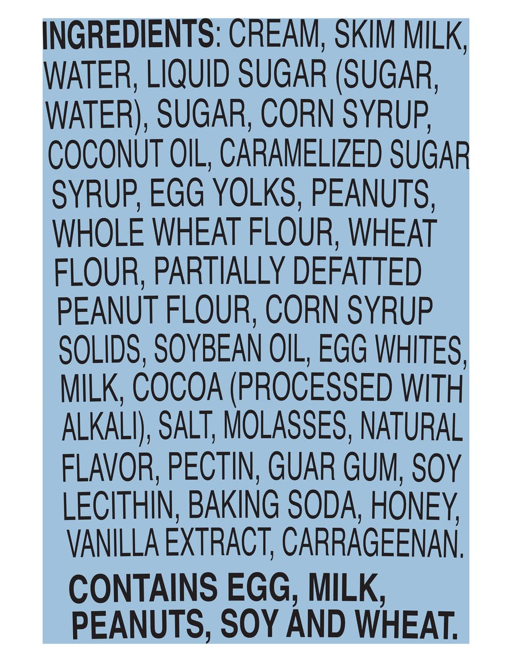 Ingredients: Cream, Skim Milk, Water, Liquid Sugar (Sugar, Water), Sugar, Corn Syrup, Coconut Oil, Caramelized Sugar Syrup, Egg Yolks, Peanuts, Whole Wheat Flour, Wheat Flour, Partially Defatted Peanut Flour, Corn Syrup Solids, Soybean Oil, Egg Whites, Milk Cocoa (Processed with Alkali), Salt, Molasses, Natural Flavor, Pectin, Guar Gum, Soy Lecithin, Baking Soda, Honey, Vanilla Extract, Carrageenan Contains: Eggs, Milk, Peanuts, Soybeans, Wheat, Corn