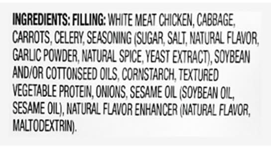 Ingredients: Filling: White Meat Chicken, Cabbage, Carrots, Celery, Seasoning (Sugar, Salt, Natural Flavor, Garlic Powder, Natural Spice, Yeast Extract), Soybean and/or Cottonseed Oils, Cornstarch, Textured Vegetable Protein, Onions, Sesame Oil (Soybean Oil, Sesame Oil), Natural Flavor Enhancer (Natural Flavor, Maltodextrin). Crust: Wheat Flour, Water, Soybean and/or Cottonseed Oils, Enriched Yellow Corn Flour (Corn Flour, Niacin, Iron, Thiamine, Riboflavin, Folic Acid), Sugar, Cornstarch, Salt, All Purpose Shortening (Soybean Oil, Hydrogenated Soybean Oil, Hydrogenated Cottonseed Oil), Soy Lecithin, Eggs, Calcium Propionate, Baking Powder (Monocalcium Phosphate, Sodium Bicarbonate, Cornstarch). Sauce: Water, Sugar, Apple Cider Vinegar, Tomato Paste, Cornstarch, Distilled White Vinegar, Pineapple Juice Concentrate, Salt, Lemon Juice Concentrate, Citric Acid Contains: Eggs, Soybeans, Wheat, Sesame, Tree Nuts, Corn