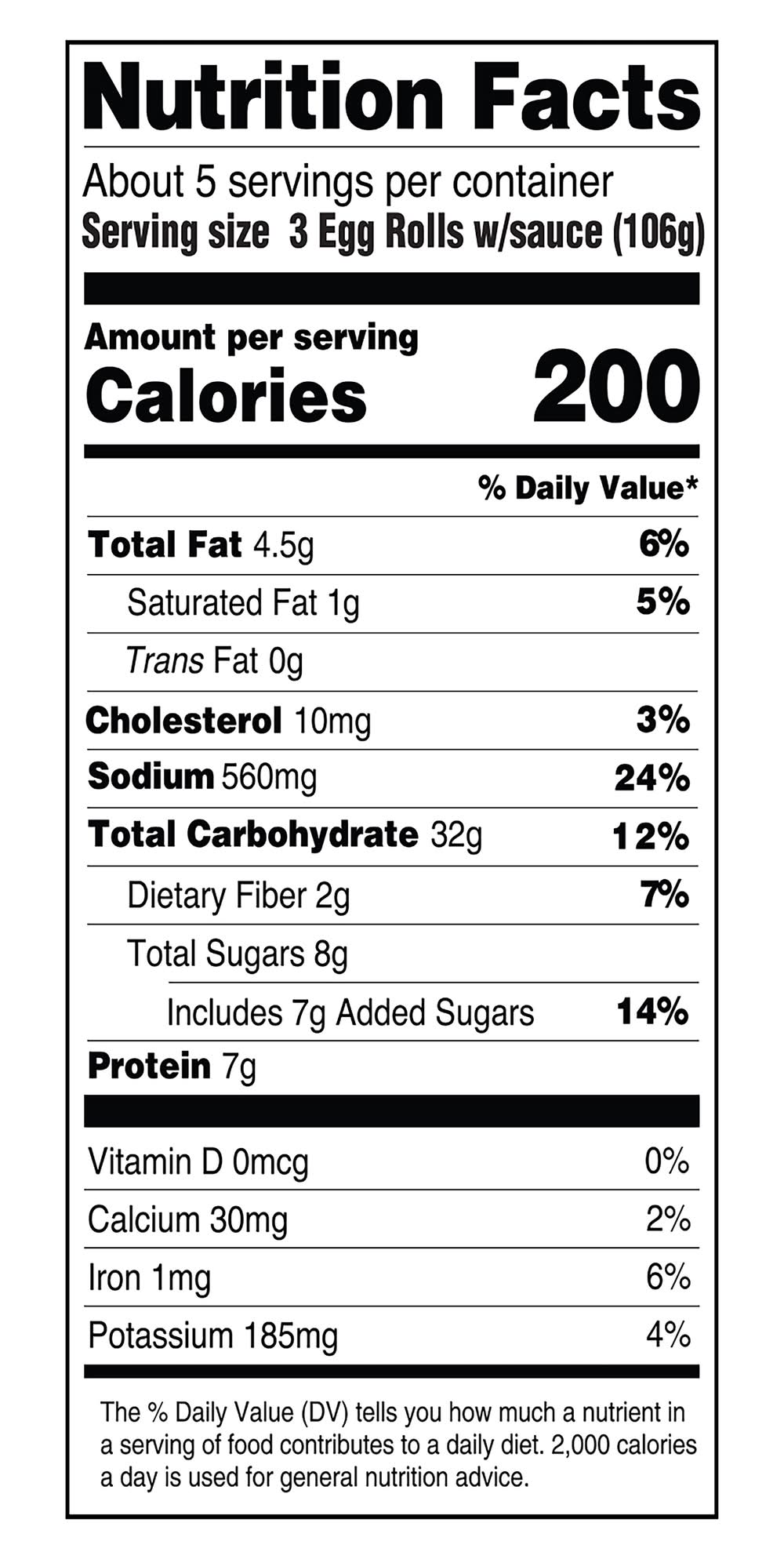 Directions for use: Heating Instructions: Important-keep frozen until used. Remove product from packaging. Heat directly from frozen or immediately after thawing under refrigeration. Product will be hot after heating, allow product to cool for 1-2 minutes before eating. Thaw sauce in warm water for a minimum of 1-2 minutes. 1. Conventional oven: (Preferred method for best results) Preheat oven to 350 degrees F. Line cookie sheet with foil. Frozen: Bake egg rolls on a cookie sheet 12-15 minutes, turning over once to reach an internal temperature of 165 degrees F. Thawed: Bake egg rolls on a cookie sheet 8-10 minutes, turning over once to reach an internal temperature of 165 degrees F. 2. Pan/Deep fry: For best results partially thaw egg rolls first. Preheat oil to 350 degrees F. Fry egg rolls for 4-5 minutes or until they reach an internal temperature of 165 F. If egg rolls are thawed completely, reduce cooking time to 3-4 minutes. 3. Microwave oven: (For soft and tender egg rolls) Instructions based on 1100-watt microwave oven, cooking times based on one egg roll and may vary. Frozen: 2 minutes on high power, turning over once to reach an internal temperature of 165 degrees F. Thawed: 1 minute on high power, turning over once to reach an internal temperature of 165 degrees F. Keep frozen. Storage recommendation: Keep frozen.