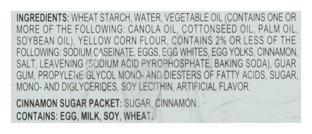 Ingredients: Wheat Starch, Water, Vegetable Oil (Contains One or More of the Following: Canola Oil, Cottonseed Oil, Palm Oil, Soybean Oil), Yellow Corn Flour, Contains 2% or Less of the Following: Sodium Caseinate, Eggs, Egg Whites, Egg Yolks, Cinnamon, Salt, Leavening (Sodium Acid Pyrophosphate, Baking Soda), Guar Gum, Propylene Glycol Mono- and Diesters of Fatty Acids, Sugar, Mono- and Diglycerides, Soy Lecithin, Artificial Flavor, Cinnamon Sugar Packet: Sugar, Cinnamon Contains: Eggs, Milk, Soybeans, Wheat, Corn