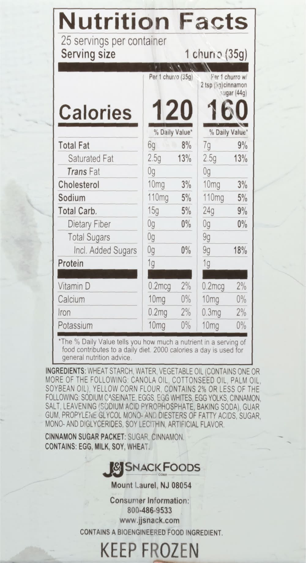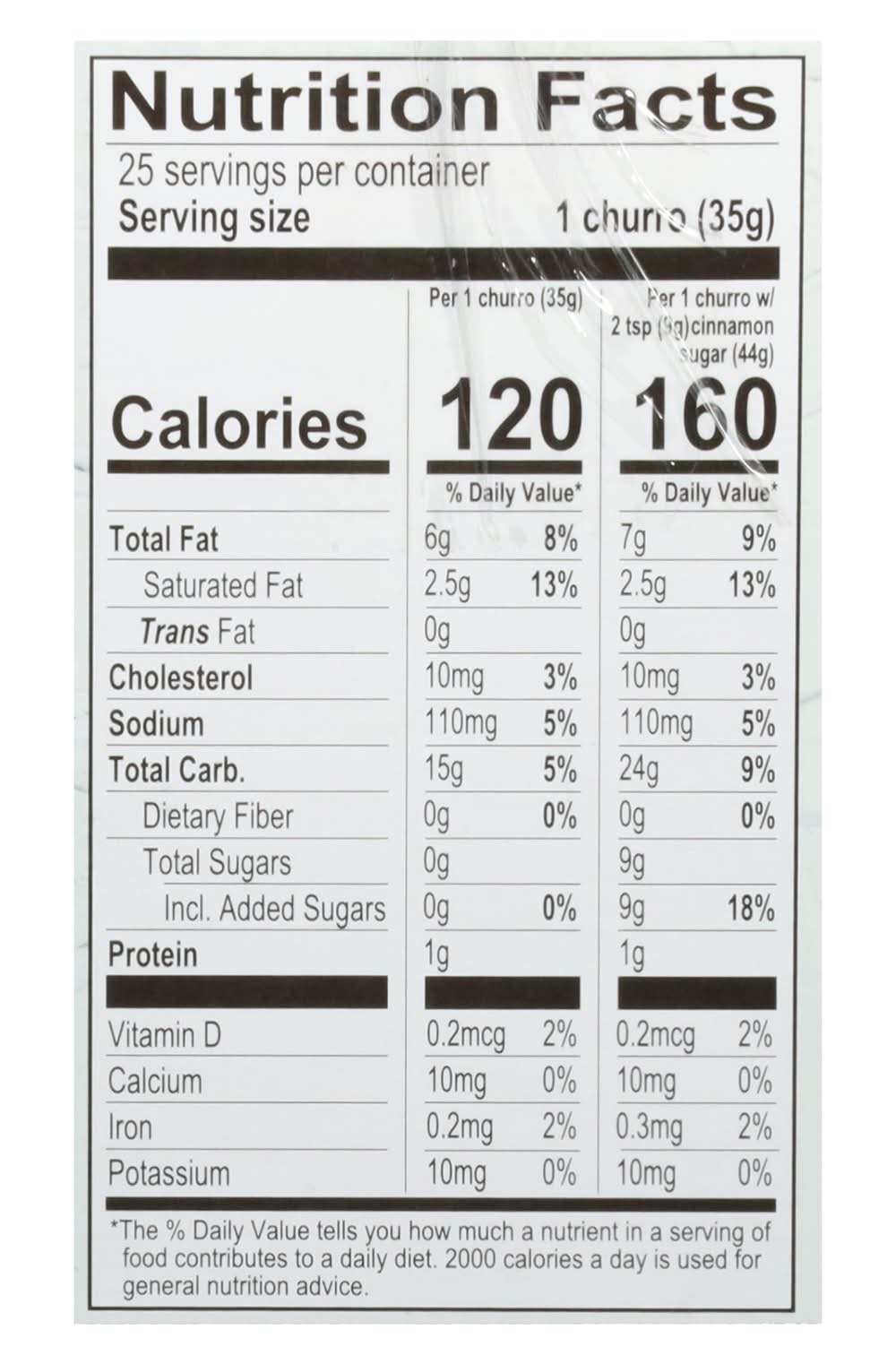 Directions for use: Heating Instructions: 1. Preheat oven to 400 degrees F. 2. Pull out wire rack from oven. 3. Place churros on wire rack. 4. Heat churros for the required time: 6 Churros: Approximately 4 1/2 minutes. 12 Churros: Approximately 7 1/2 minutes. 5. Bring to internal temperature of 165 degrees. Churros are ready when they turn golden brown and when tiny bubbles appear on the surface. The product texture should be crisp on the outside, and moist and chewy on the inside. The product will be sizzling when ready. 6. Using tongs, remove churros from oven and sprinkle cinnamon sugar mixture on top until uniformly coated. Tap off any excess topping. Keep frozen. Storage recommendation: Keep frozen.