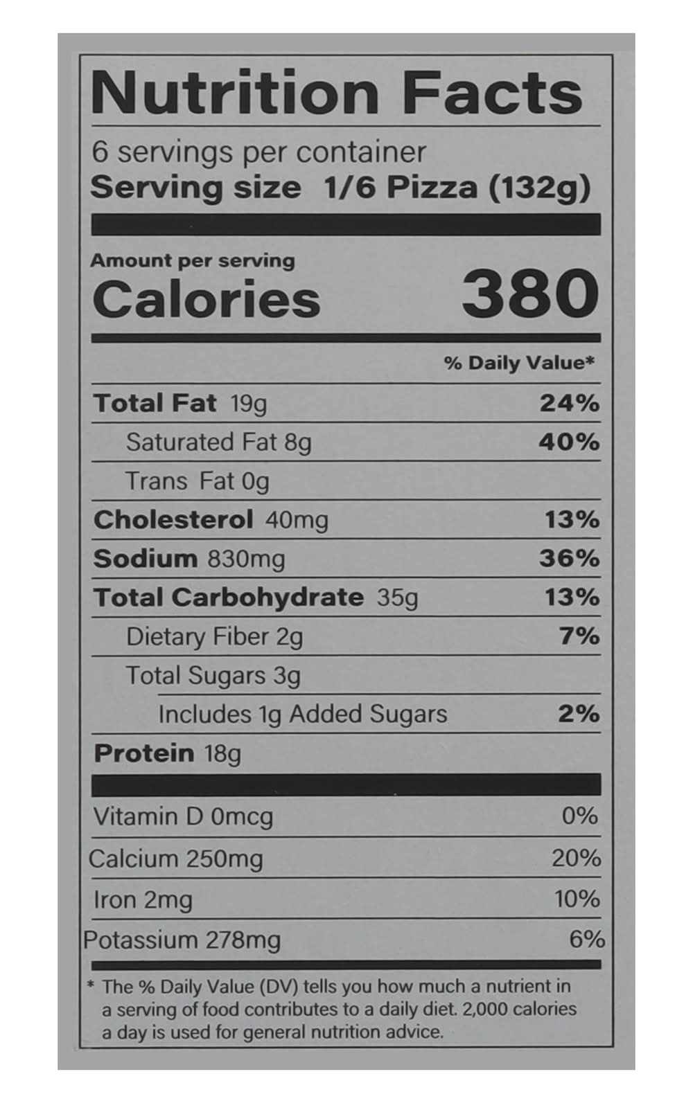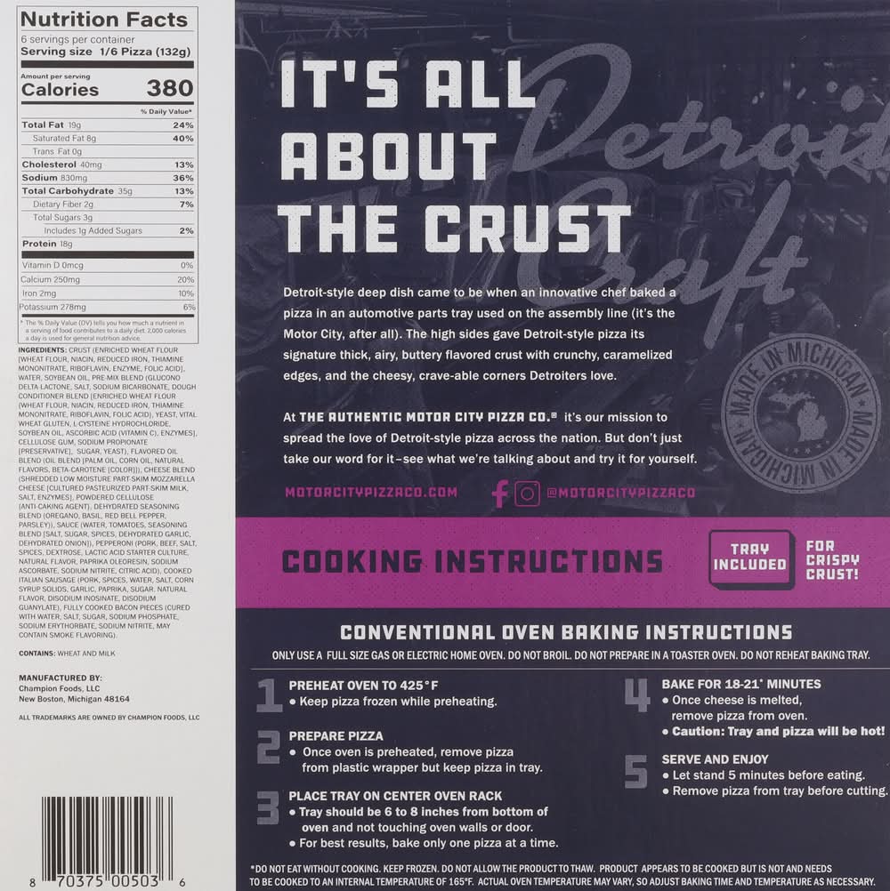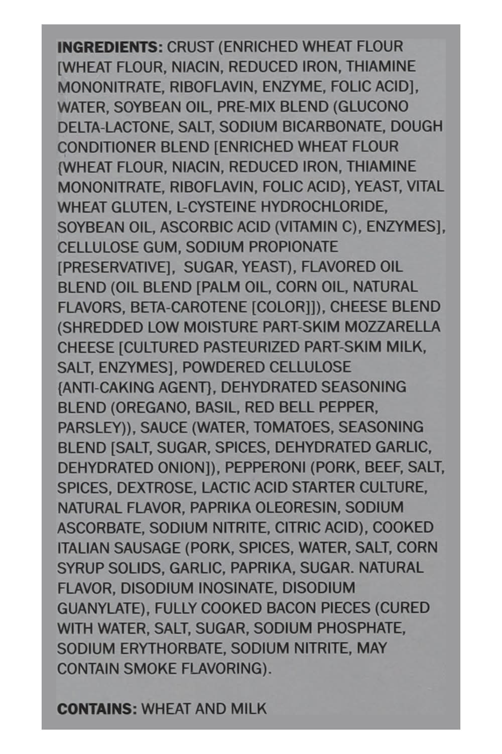 Ingredients: Crust (Enriched Wheat Flour [Wheat Flour, Niacin, Reduced Iron, Thiamine Mononitrate, Riboflavin, Enzyme, Folic Acid], Water, Soybean Oil, Pre-Mix Blend (Glucono Delta-Lactone, Salt, Sodium Bicarbonate, Dough Conditioner Blend [Enriched Wheat Flour (Wheat Flour, Niacin, Reduced Iron, Thiamine Mononitrate, Riboflavin, Folic Acid), Yeast, Vital Wheat Gluten, L-Cysteine Hydrochloride, Soybean Oil, Ascorbic Acid (Vitamin C), Enzymes], Cellulose Gum, Sodium Propionate [Preservative], Sugar, Yeast), Flavored Oil Blend (Oil Blend [Palm Oil, Corn Oil, Natural Flavors, Beta-Carotene [Color]]), Cheese Blend (Shredded Low Moisture Part-Skim Mozzarella Cheese [Cultured Pasteurized Part-Skim Milk, Salt, Enzymes], Powdered Cellulose (Anti-Caking Agent), Dehydrated Seasoning Blend (Oregano, Basil, Red Bell Pepper, Parsley)), Sauce (Water, Tomatoes, Seasoning Blend [Salt, Sugar, Spices, Dehydrated Garlic, Dehydrated Onion]), Pepperoni (Pork, Beef, Salt, Spices, Dextrose, Lactic Acid Starter Culture, Natural Flavor, Paprika Oleoresin, Sodium Ascorbate, Sodium Nitrite, Citric Acid), Cooked Italian Sausage (Pork, Spices, Water, Salt, Corn Syrup Solids, Garlic, Paprika, Sugar, Natural Flavor, Disodium Inosinate, Disodium Guanylate), Fully Cooked Bacon Pieces (Cured with Water, Salt, Sugar, Sodium Phosphate, Sodium Erythorbate, Sodium Nitrite, May Contain Smoke Flavoring) Contains: Wheat, Soybeans, Gluten, Milk, Corn