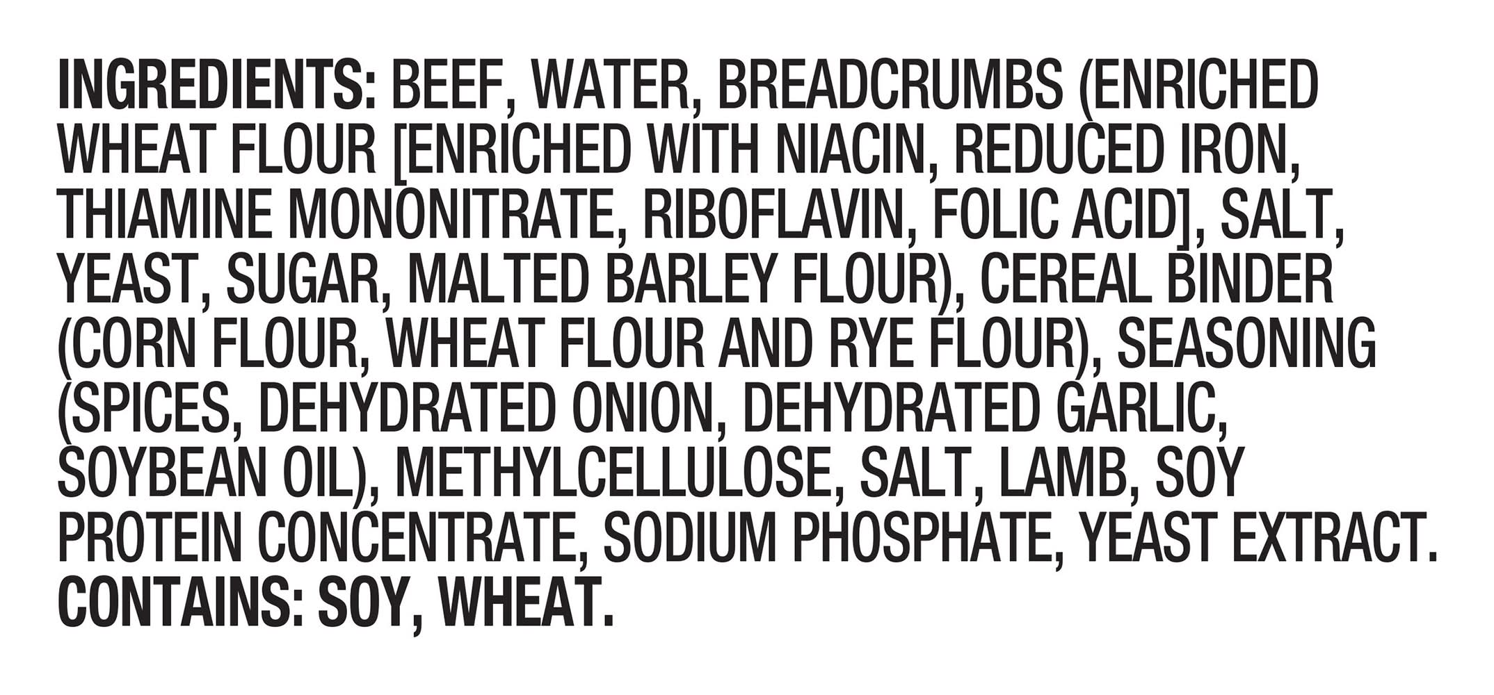 Ingredients: Beef, Water, Breadcrumbs (Enriched Wheat Flour [Enriched with Niacin, Reduced Iron, Thiamine Mononitrate, Riboflavin, Folic Acid], Salt, Yeast, Sugar, Malted Barley Flour), Cereal Binder (Corn Flour, Wheat Flour and Rye Flour), Seasoning (Spices, Dehydrated Onion, Dehydrated Garlic, Soybean Oil), Methylcellulose, Salt, Lamb, Soy Protein Concentrate, Sodium Phosphate, Yeast Extract Contains: Soybeans, Wheat, Barley