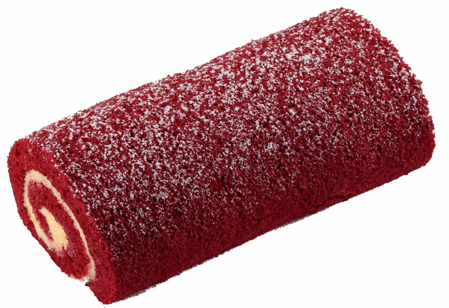 Moist red velvet flavored cake rolled around creamy cream cheese filling.