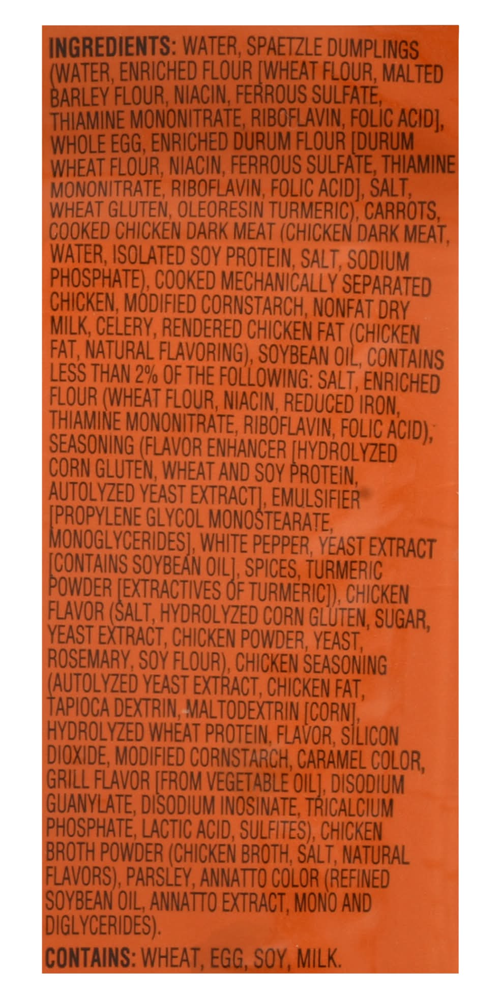Ingredients: Water, Spaetzle Dumplings (Water, Enriched Flour [Wheat Flour, Malted Barley Flour, Niacin, Ferrous Sulfate, Thiamine Mononitrate, Riboflavin, Folic Acid], Whole Egg, Enriched Durum Flour (Durum Wheat Flour, Niacin, Ferrous Sulfate, Thiamine Mononitrate, Riboflavin, Folic Acid), Salt, Wheat Gluten, Oleoresin Turmeric) Carrots, Cooked Chicken Dark Meat (Chicken Dark Meat, Water, Isolated Soy Protein, Salt, Sodium Phosphate), Cooked Mechanically Separated Chicken, Modified Cornstarch, Nonfat Dry Milk, Celery, Rendered Chicken Fat (Chicken Fat, Natural Flavoring), Soybean Oil, Contains Less than 2% of the Following: Salt, Enriched Flour (Wheat Flour, Niacin, Reduced Iron, Thiamine Mononitrate, Riboflavin, Folic Acid), Seasoning (Flavor Enhancer [Hydrolyzed Corn Gluten, Wheat and Soy Protein, Autolyzed Yeast Extract], Emulsifier [Propylene Glycol Monostearate, Monoglycerides], White Pepper, Yeast Extract [Contains Soybean Oil], Spices, Turmeric Powder [Extractives of Turmeric]), Chicken Flavor (Salt, Hydrolyzed Corn Gluten, Sugar, Yeast Extract, Chicken Powder, Yeast, Rosemary, Soy Flour), Chicken Seasoning (Autolyzed Yeast Extract, Chicken Fat, Tapioca Dextrin, Maltodextrin (Corn], Hydrolyzed Wheat Protein, Flavor, Silicon Dioxide, Modified Cornstarch, Caramel Color, Grill Flavor [from Vegetable Oil], Disodium Guanylate, Disodium Inosinate, Tricalcium Phosphate, Lactic Acid, Sulfites), Chicken Broth Powder (Chicken Broth, Salt, Natural Flavors), Parsley, Annatto Color (Refined Soybean Oil, Annatto Extract, Mono and Diglycerides) Contains: Wheat, Eggs, Gluten, Soybeans, Milk