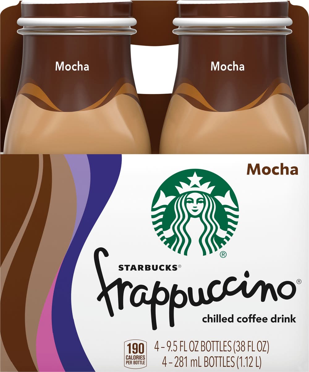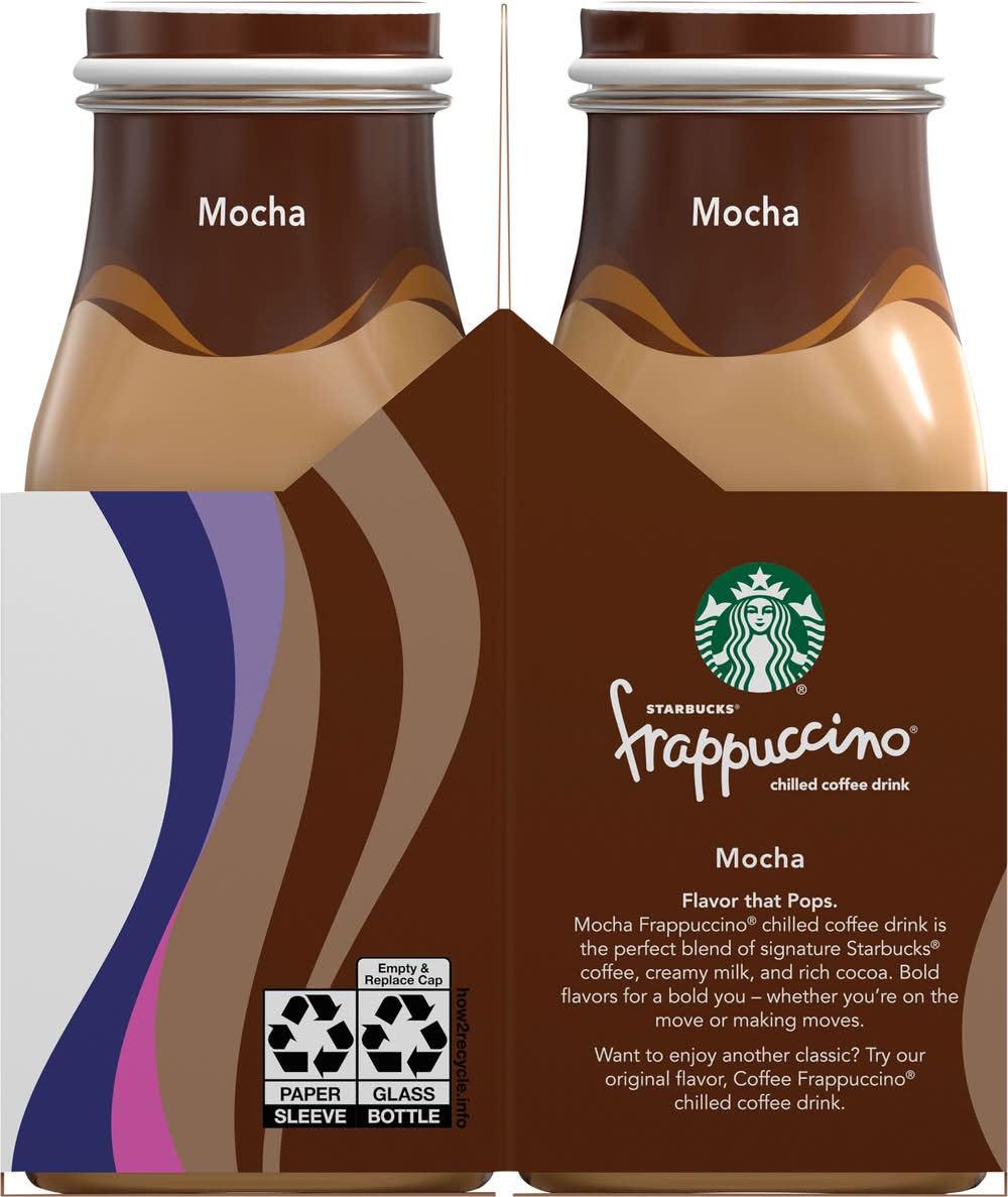 Iced Coffee, Ready-to-Drink, Mocha Frappuccino, Glass, 4 Ct Package • Flavor: Mocha • Pack size: 4 • North American Coffee Partnership, Purchase,NY,10577 • Packaging: Reusable