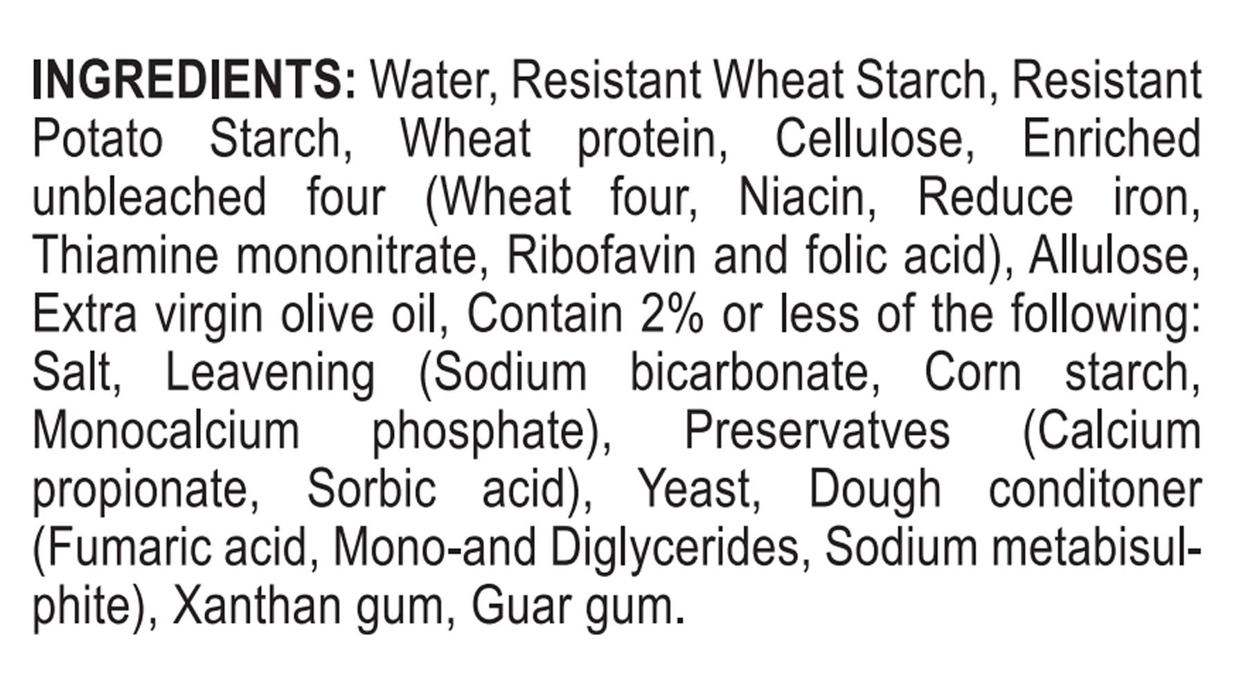 Ingredients: Water, Resistant Wheat Starch, Resistant Potato Starch, Wheat Protein, Cellulose, Enriched Unbleached Flour (Wheat Flour, Niacin, Reduce Iron, Thiamine Mononitrate, Riboflavin and Folic Acid), Allulose, Extra Virgin Olive Oil, Contain 2% or Less of the Following: Salt, Leavening (Sodium Bicarbonate, Corn Starch, Monocalcium Phosphate), Preservatives (Calcium Propionate, Sorbic Acid), Yeast, Dough Conditioner (Fumaric Acid, Mono-and Diglycerides, Sodium Metabisulphite), Xanthan Gum, Guar Gum Contains: Wheat, Corn