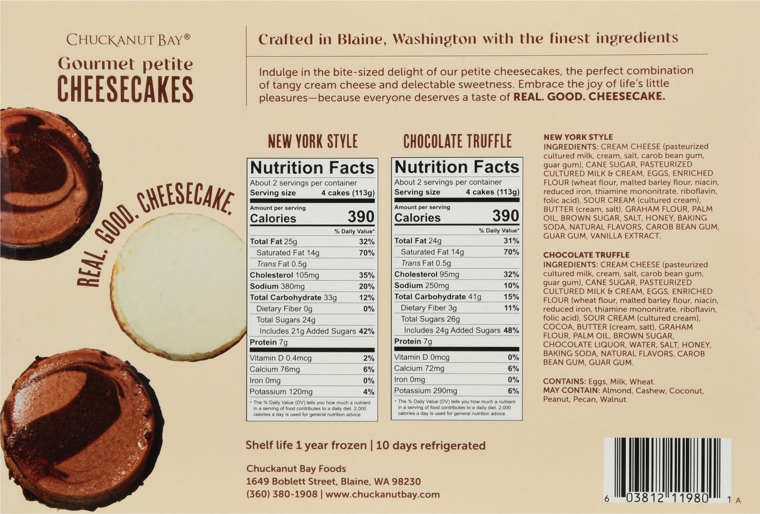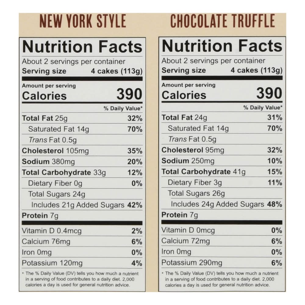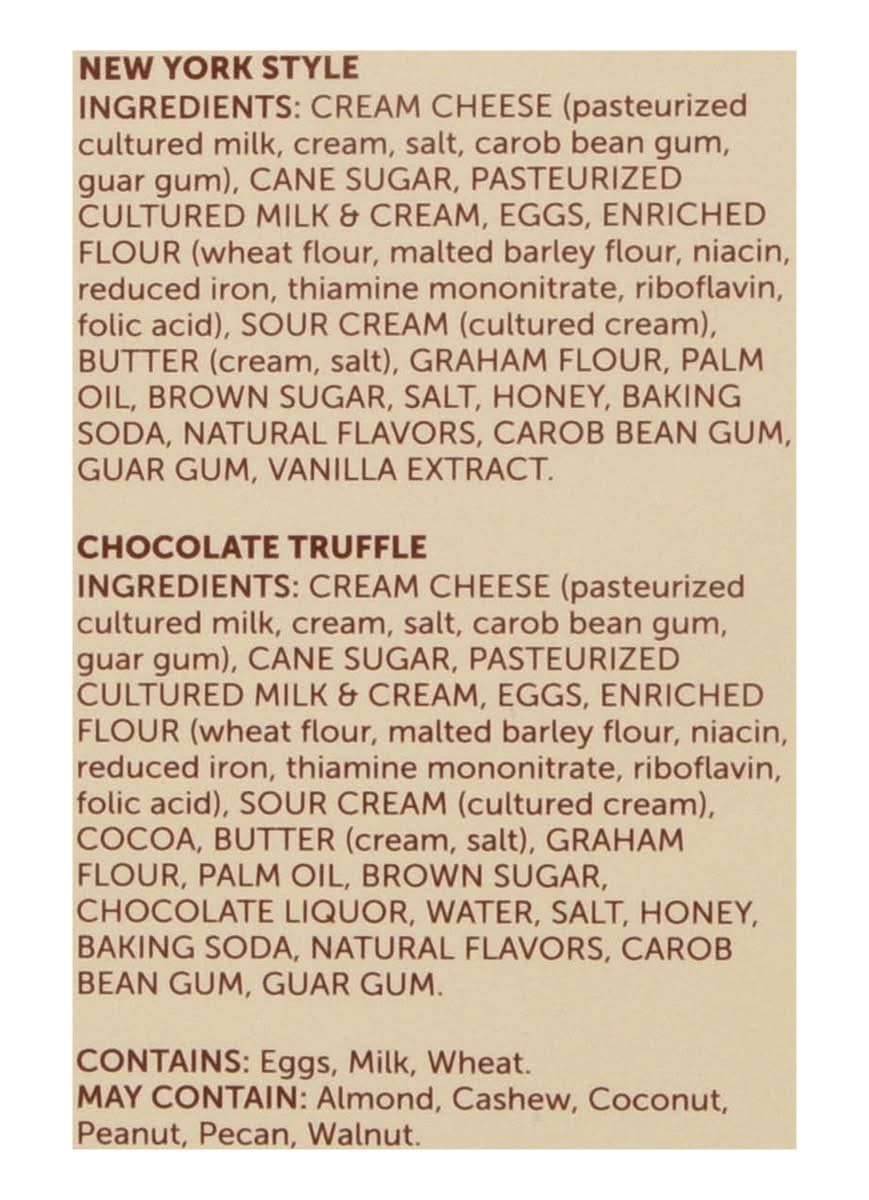 Ingredients: New York Style: Cream Cheese (Pasteurized Cultured Milk, Cream, Salt, Carob Bean Gum, Guar Gum), Cane Sugar, Pasteurized Cultured Milk & Cream, Eggs, Enriched Flour (Wheat Flour, Malted Barley Flour, Niacin, Reduced Iron, Thiamine Mononitrate, Riboflavin, Folic Acid), Sour Cream (Cultured Cream), Butter (Cream, Salt), Graham Flour, Palm Oil, Brown Sugar, Salt, Honey, Baking Soda, Natural Flavors, Carob Bean Gum, Guar Gum, Vanilla Extract. Chocolate Truffle: Cream Cheese (Pasteurized Cultured Milk, Cream, Salt, Carob Bean Gum, Guar Gum), Cane Sugar, Pasteurized Cultured Milk & Cream, Eggs, Enriched Flour (Wheat Flour, Malted Barley Flour, Niacin, Reduced Iron, Thiamine Mononitrate, Riboflavin, Folic Acid), Sour Cream (Cultured Cream), Cocoa, Butter (Cream, Salt), Graham Flour, Palm Oil, Brown Sugar, Chocolate Liquor, Water, Salt, Honey, Baking Soda, Natural Flavors, Carob Bean Gum, Guar Gum. Contains: Milk, Eggs, Wheat, Barley, Tree Nuts, Almonds, Tree Nuts, Cashews, Tree Nuts, Coconuts, Peanuts, Tree Nuts, Pecans, Tree Nuts, Walnuts/Butternuts