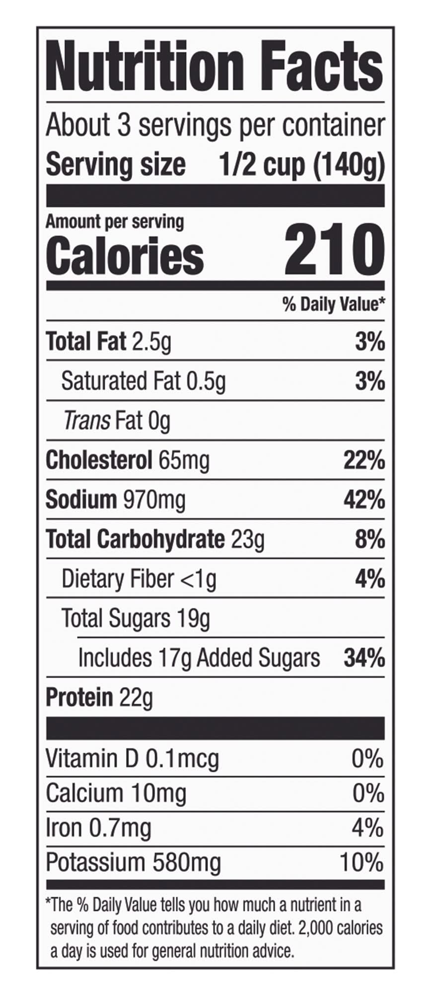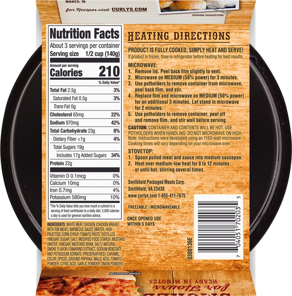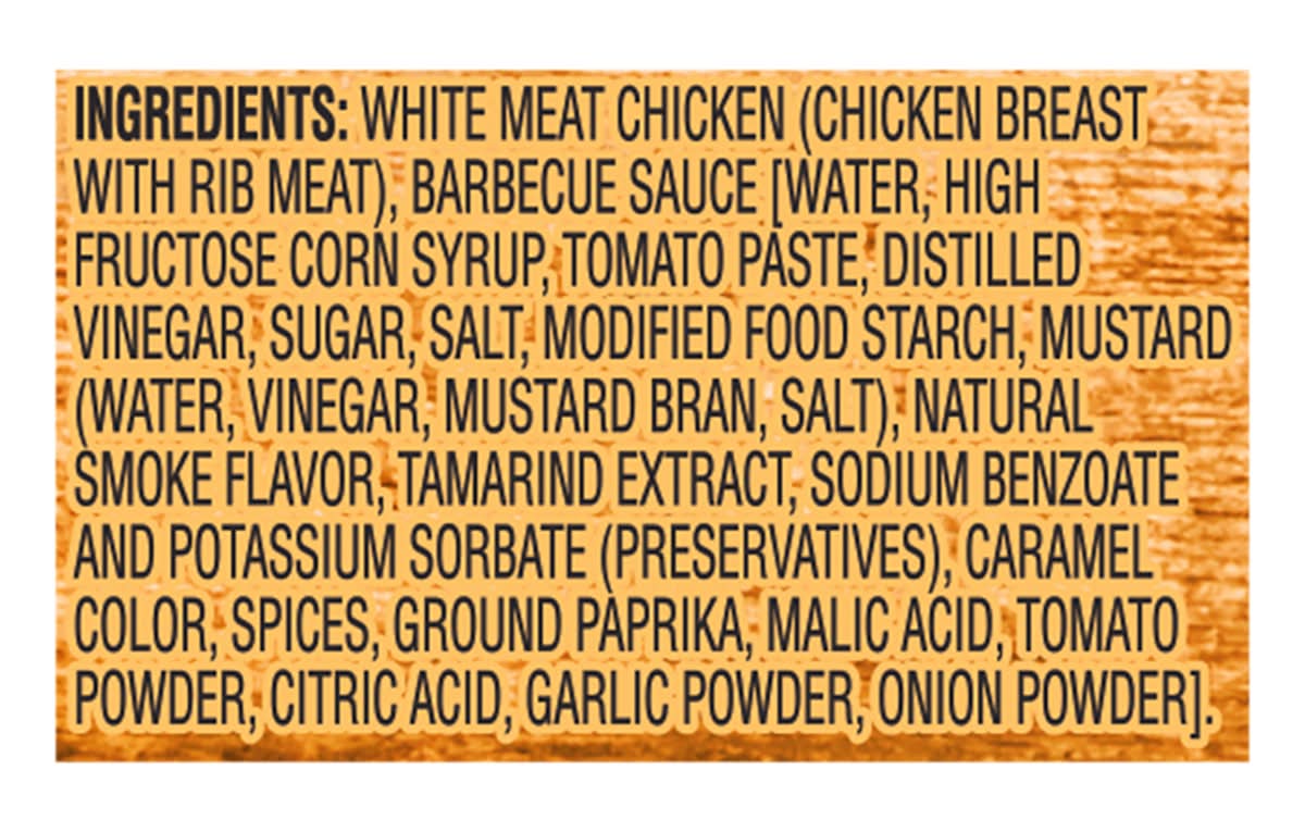 Ingredients: White Meat Chicken (Chicken Breast with Rib Meat), Barbecue Sauce [Water, High Fructose Corn Syrup, Tomato Paste, Distilled Vinegar, Sugar, Salt, Modified Food Starch, Mustard (Water, Vinegar, Mustard Bran, Salt), Natural Smoke Flavor, Tamarind Extract, Sodium Benzoate and Potassium Sorbate (Preservatives), Caramel Color, Spices, Ground Paprika, Malic Acid, Tomato Powder, Citric Acid, Garlic Powder, Onion Powder] Contains: Mustard