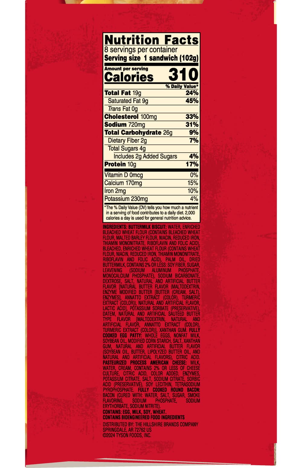Biscuit, Egg, Cheese & Bacon Sandwiches • Number of servings: 8 • The Hillshire Brands Company, Chicago, IL, 60607 • Packaging: Reusable