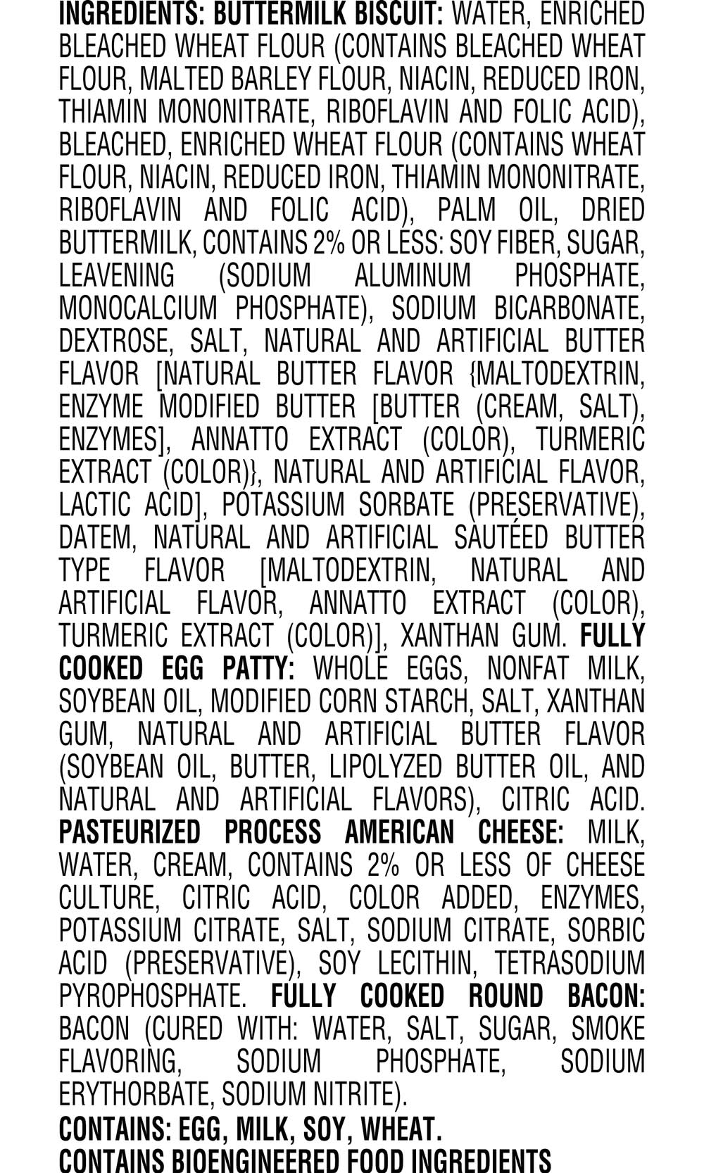 Ingredients: Buttermilk Biscuit: Water, Enriched Bleached Wheat Flour (Contains Bleached Wheat Flour, Malted Barley Flour, Niacin, Reduced Iron, Thiamin Mononitrate, Riboflavin And Folic Acid), Bleached, Enriched Wheat Flour (Contains Wheat Flour, Niacin, Reduced Iron, Thiamin Mononitrate, Riboflavin And Folic Acid), Palm Oil, Dried Buttermilk, Contains 2% Or Less: Soy Fiber, Sugar, Leavening (Sodium Aluminum Phosphate, Monocalcium Phosphate), Sodium Bicarbonate, Dextrose, Salt, Natural and Artificial Butter Flavor [Natural Butter Flavor {Maltodextrin, Enzyme Modified Butter [Butter (Cream, Salt), Enzymes], Annatto Extract (Color), Turmeric Extract (Color)}, Natural And Artificial Flavor, Lactic Acid], Potassium Sorbate (Preservative), DATEM, Natural and Artificial Sautéed Butter Type Flavor [Maltodextrin, Natural And Artificial Flavor, Annatto Extract (Color), Turmeric Extract (Color)], Xanthan Gum. Fully Cooked Egg Patty: Whole Eggs, Nonfat Milk, Soybean Oil, Modified Corn Starch, Salt, Xanthan Gum, Natural And Artificial Butter Flavor (Soybean Oil, Butter, Lipolyzed Butter Oil, And Natural And Artificial Flavors), Citric Acid. Pasteurized Process American Cheese: Milk, Water, Cream, Contains 2% Or Less Of Cheese Culture, Citric Acid, Color Added, Enzymes, Potassium Citrate, Salt, Sodium Citrate, Sorbic Acid (Preservative), Soy Lecithin, Tetrasodium Pyrophosphate. Fully Cooked Round Bacon: bacon (cured with: water, salt, sugar, smoke flavoring, sodium phosphate, sodium erythorbate, sodium nitrite). Contains: Eggs, Milk, Soy, Wheat