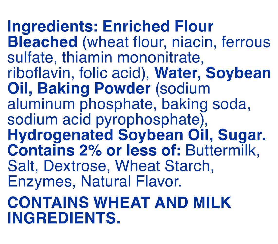 Ingredients: Enriched Flour Bleached (Wheat Flour, Niacin, Ferrous Sulfate, Thiamin Mononitrate, Riboflavin, Folic Acid), Water, Soybean Oil, Baking Powder (Sodium Aluminum Phosphate, Baking Soda, Sodium Acid Pyrophosphate), Hydrogenated Soybean Oil, Sugar, Contains 2% or Less of: Buttermilk, Salt, Dextrose, Wheat Starch, Enzymes, Natural Flavor Contains: Wheat, Milk, Soybeans