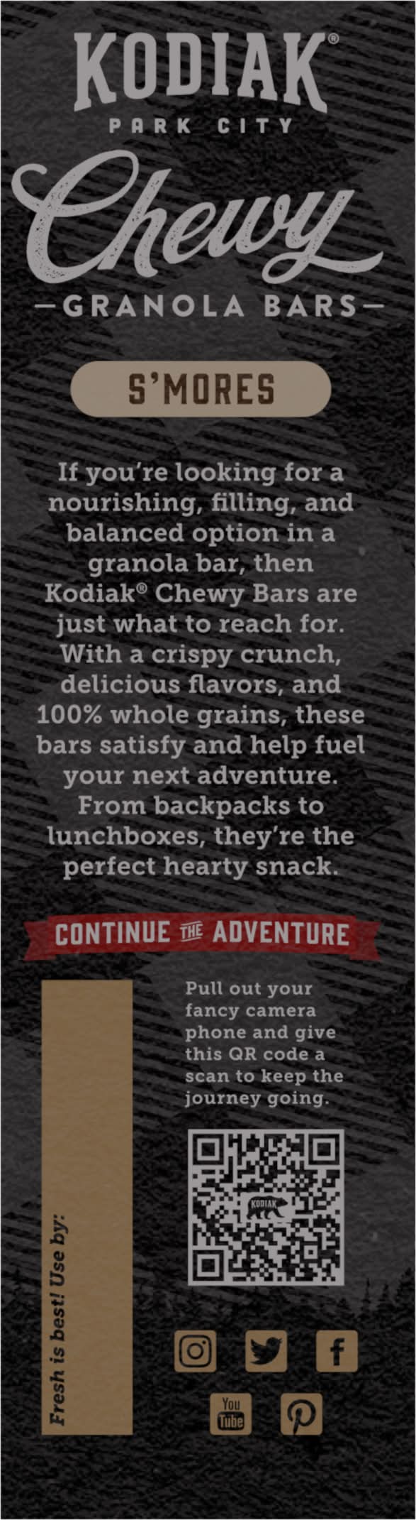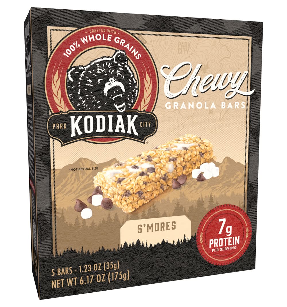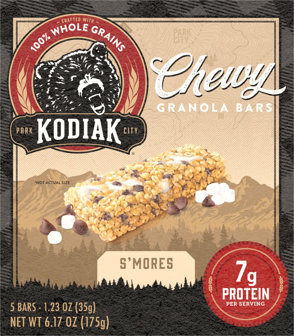 Whole Grains Taste Better If you're looking for a nourishing, filling, and balanced option when it comes to your granola bar then Kodiak Chewy Bars are just what to reach for. With non-GMO ingredients, delicious flavors, and 100% whole grains these bars don't just satisfy, they help fuel your next adventure. From backpacks to lunchboxes, they're the perfect protein-packed snack. • Flavor: S'mores • Pack size: 5 • Packaging: Reusable
