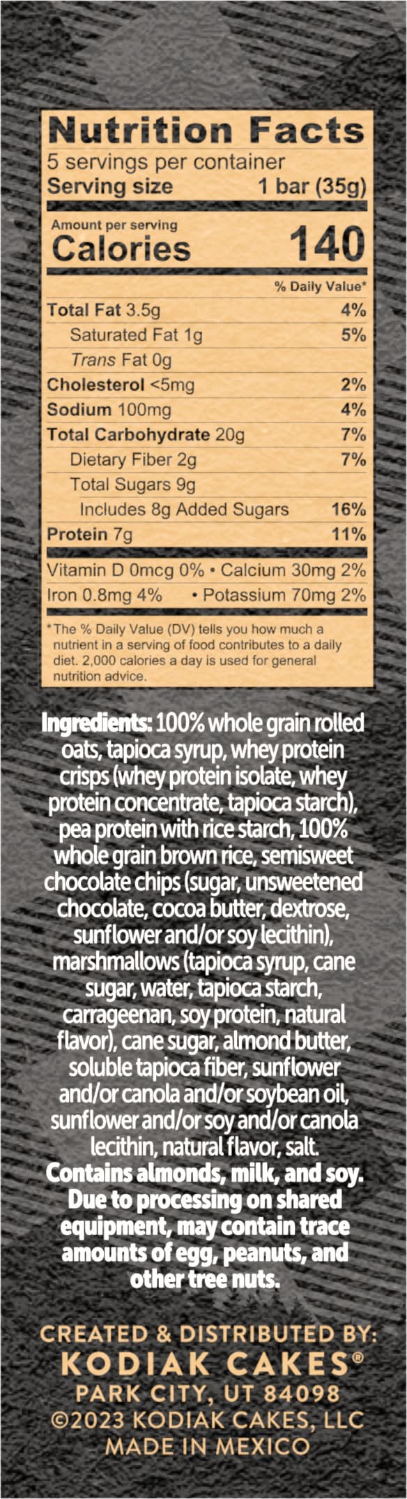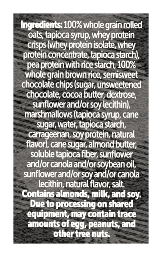Ingredients: 100% Whole Grain Rolled Oats, Tapioca Syrup, Whey Protein Crisps (Whey Protein Isolate, Whey Protein Concentrate, Tapioca Starch), Pea Protein with Rice Starch, 100% Whole Grain Brown Rice, Semisweet Chocolate Chips (Sugar, Unsweetened Chocolate, Cocoa Butter, Dextrose, Sunflower and/or Soy Lecithin), Marshmallows (Tapioca Syrup, Cane Sugar, Water, Tapioca Starch, Carrageenan, Soy Protein, Natural Flavor), Cane Sugar, Almond Butter, Soluble Tapioca Fiber, Sunflower and/or Canola and/or Soybean Oil, Sunflower and/or Soy and/or Canola Lecithin, Natural Flavor, Salt Contains: Tree Nuts, Almonds, Milk, Soybeans, Oat, Eggs, Peanuts, Tree Nuts
