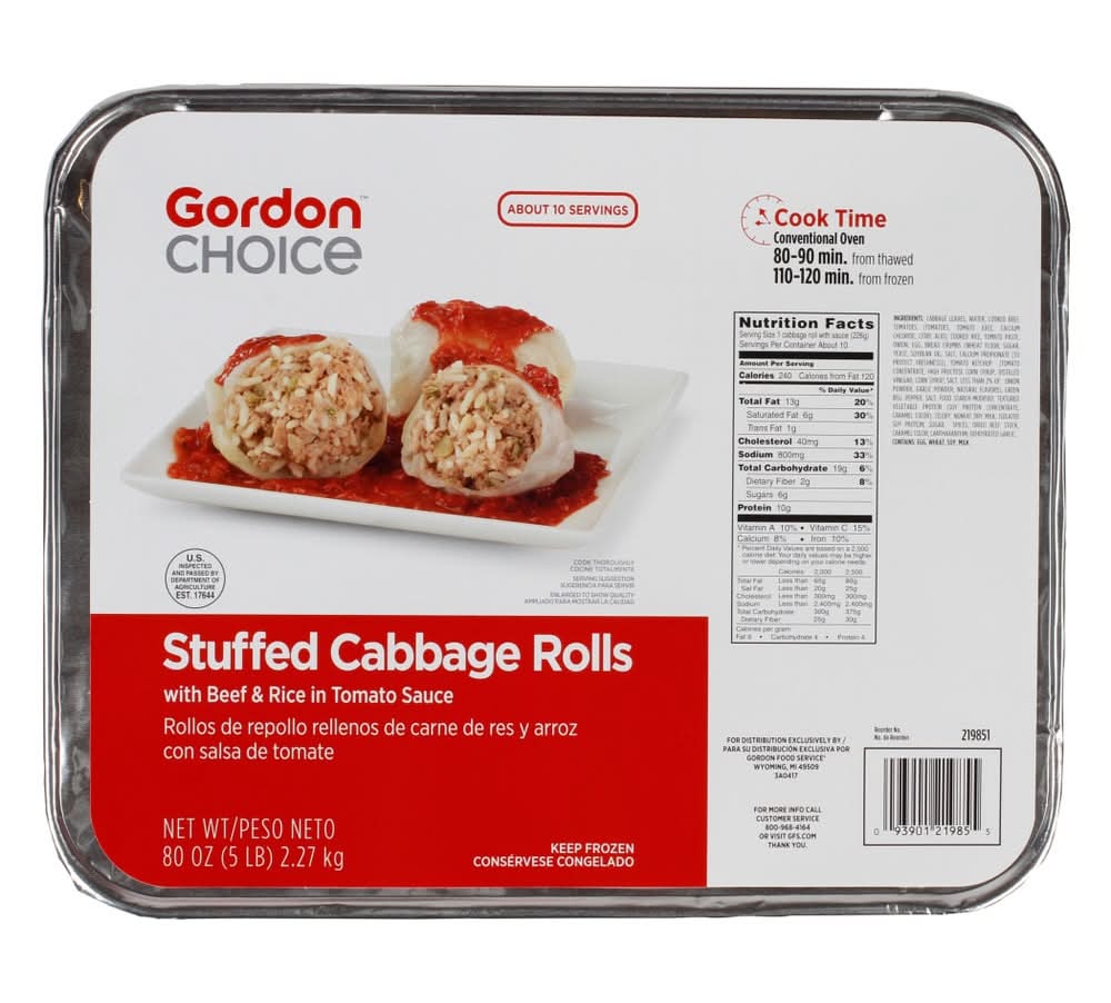 Entree, Stuffed Cabbage Rolls, with Sauce, Frozen, 5 Lb Tray