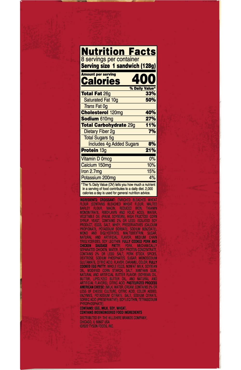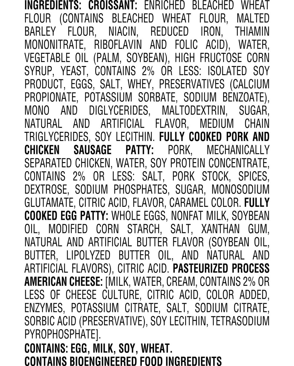 Ingredients: Croissant: Enriched Bleached Wheat Flour (Contains Bleached Wheat Flour, Malted Barley Flour, Niacin, Reduced Iron, Thiamin Mononitrate, Riboflavin And Folic Acid), Water, Vegetable Oil (Palm, Soybean), High Fructose Corn Syrup, Yeast, Contains 2% Or Less: Isolated Soy Product, Eggs, Salt, Whey, Preservatives (Calcium Propionate, Potassium Sorbate, Sodium Benzoate), Mono And Diglycerides, Maltodextrin, Sugar, Natural And Artificial Flavor, Medium Chain Triglycerides, Soy Lecithin. Fully Cooked Pork and Chicken Sausage Patty: Pork, Mechanically Separated Chicken, Water, Soy Protein Concentrate, Contains 2% Or Less: Salt, Pork Stock, Spices, Dextrose, Sodium Phosphates, Sugar, Monosodium Glutamate, Citric Acid, Flavor, Caramel Color. Fully Cooked Egg Patty: Whole Eggs, Nonfat Milk, Soybean Oil, Modified Corn Starch, Salt, Xanthan Gum, Natural And Artificial Butter Flavor (Soybean Oil, Butter, Lipolyzed Butter Oil, And Natural And Artificial Flavors), Citric Acid. Pasteurized Process American Cheese: [Milk, Water, Cream, Contains 2% Or Less Of Cheese Culture, Citric Acid, Color Added, Enzymes, Potassium Citrate, Salt, Sodium Citrate, Sorbic Acid (Preservative), Soy Lecithin, Tetrasodium Pyrophosphate]. Contains: Eggs, Milk, Soy, Wheat