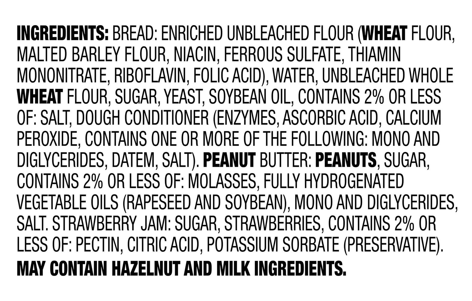 Ingredients: Bread: Enriched Unbleached Flour Wheat Flour Malted Barley Flour, Niacin, Ferrous Sulfate, Thiamin Mononitrate, Riboflavin, Folic Acid, Water, Unbleached Whole Wheat Flour, Sugar, Yeast, Soybean Oil, Contains 2% or Less of: Salt, Dough Conditioner Enzymes, Ascorbic Acid, Calcium Peroxide, Contains One or More of the Following: Mono and Diglycerides, DATEM, Salt, Peanut Butter: Peanuts, Sugar, Contains 2% or Less of: Molasses, Fully Hydrogenated Vegetable Oils Rapeseed and Soybean, Mono and Diglycerides Salt, Strawberry Jam: Sugar, Strawberries, Contains 2% or Less of: Pectin, Citric Acid, Potassium Sorbate Preservative. Contains: Barley, Wheat, Soybeans, Peanuts, Tree Nuts, Milk