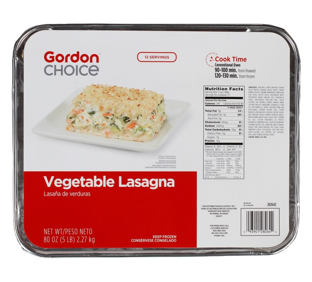 Entree, Vegetable Lasagna, Frozen, 80 Oz Tray