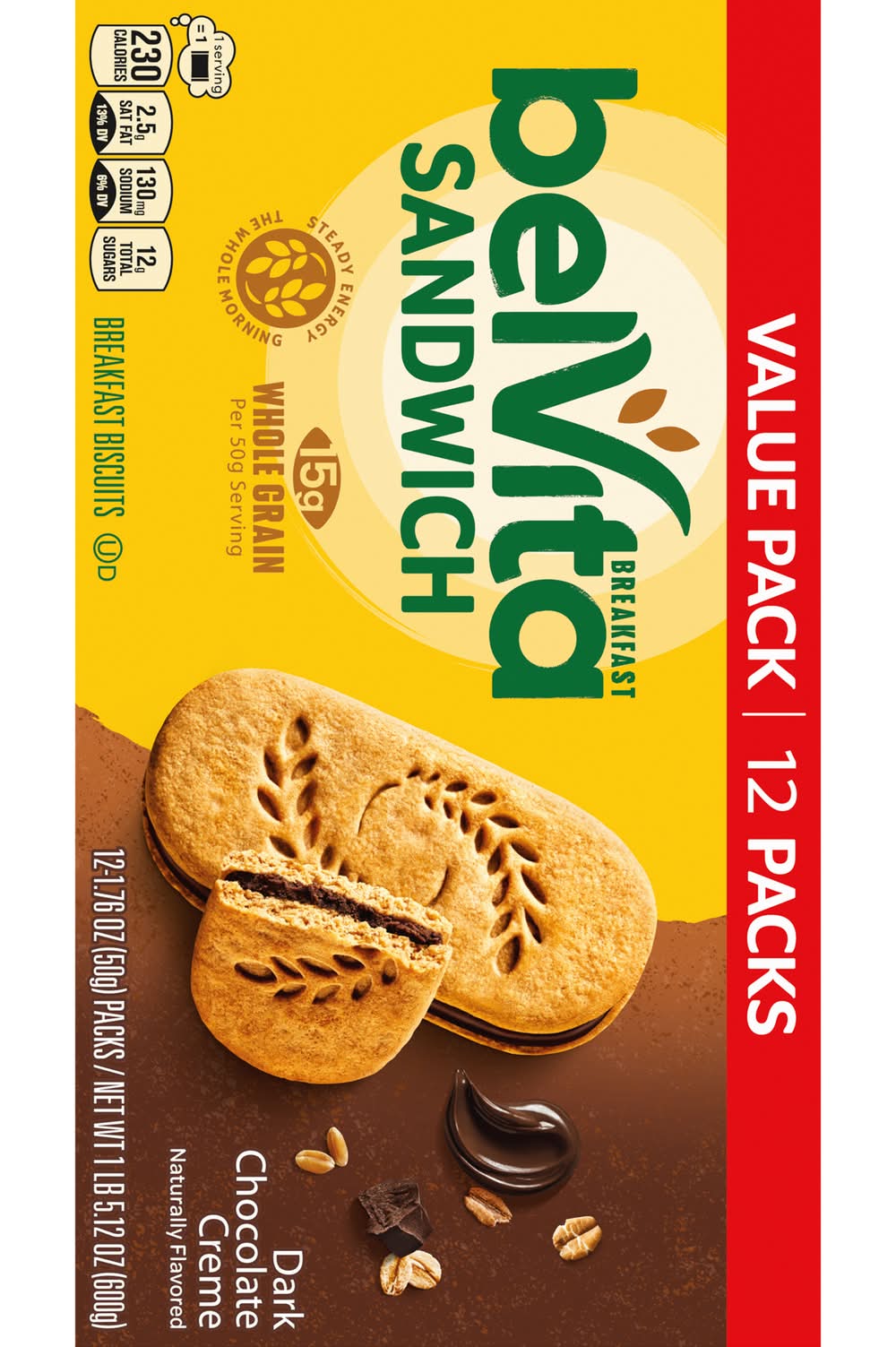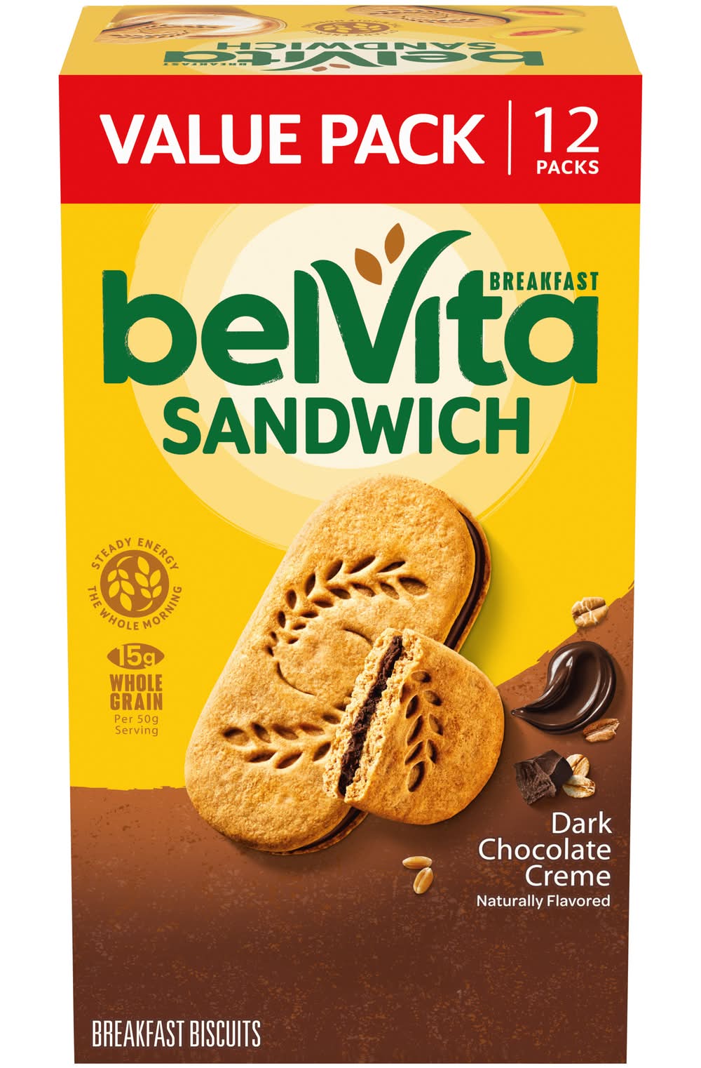 Start your morning off right with delicious belVita Breakfast Sandwich Dark Chocolate Creme Breakfast Biscuits. Featuring luscious dark chocolate flavored creme between two breakfast biscuits, these breakfast biscuits make a delicious instant breakfast food. Specially baked, these BelVita bulk breakfast sandwich cookies contain slow-release carbs that break down gradually in the body to deliver delicious, steady energy all morning long so you can enjoy these with your morning coffee, yogurt and fruit or as an instant breakfast food no matter what the morning brings. Each 50 gram serving contains 15 grams of whole grain and 3 grams of fiber for a wholesome and delicious alternative to a traditional chocolate breakfast bar. A simple addition to your morning, these cholesterol-free bulk biscuits for breakfast contain no high-fructose corn syrup and no artificial colors, flavors or sweeteners. What are you waiting for? These convenient breakfast biscuits made with wholesome grains are a great alternative to traditional breakfast snacks. These bulk chocolate biscuits are also an ideal addition to your supply of vending foods to stock machines or sell at convenience stores, concession stands or food service stations. They can even be used in college care packages! Each individual pack contains 2 belVita Breakfast Sandwich Breakfast Biscuits for you to enjoy on the go, at the office or at home for lasting morning energy. • Flavor: Dark chocolate • Number of servings: 12