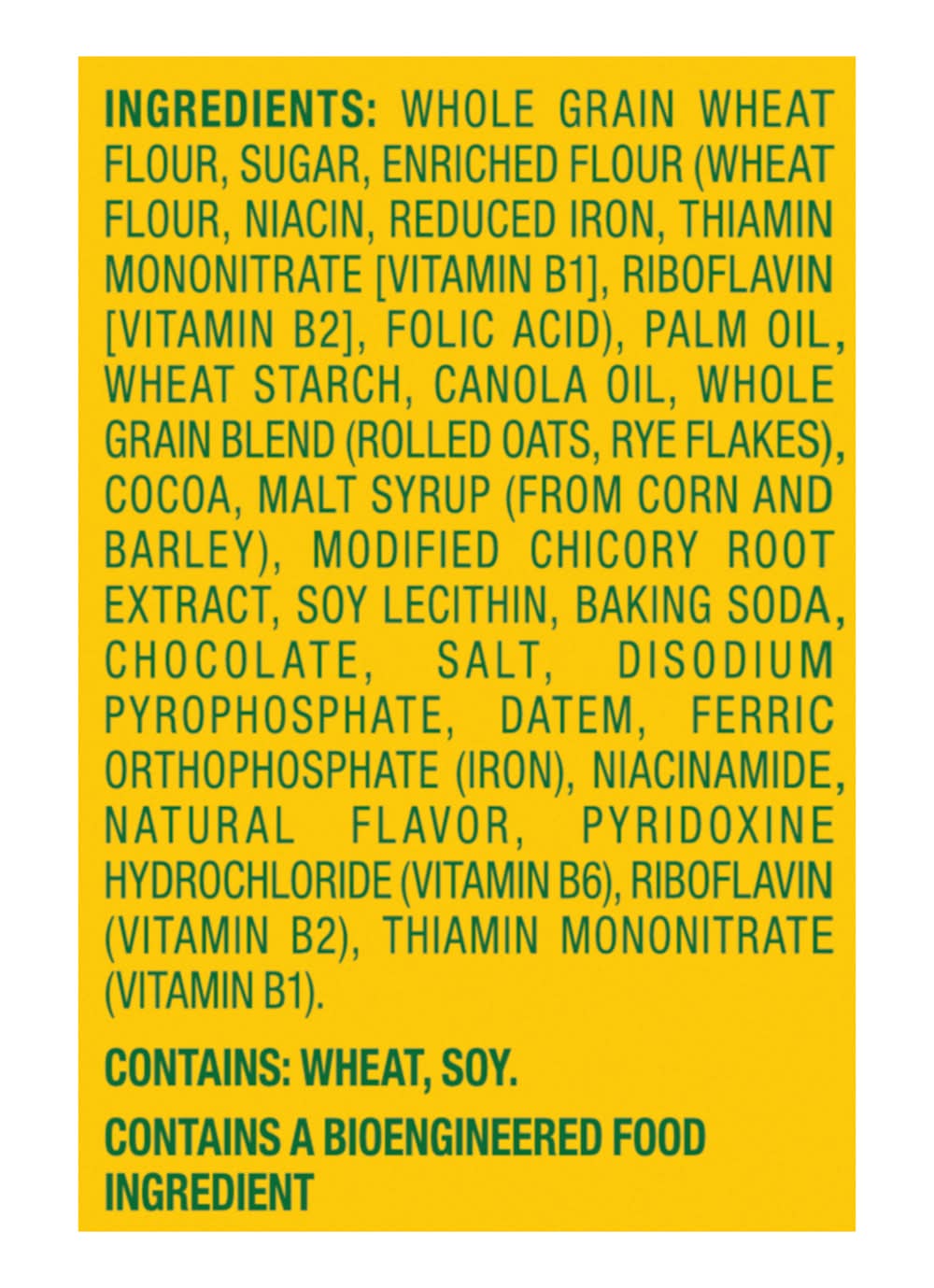Ingredients: INGREDIENTS: WHOLE GRAIN WHEAT FLOUR, SUGAR, ENRICHED FLOUR (WHEAT FLOUR, NIACIN, REDUCED IRON, THIAMIN MONONITRATE [VITAMIN B1], RIBOFLAVIN [VITAMIN B2], FOLIC ACID), PALM OIL, CORNSTARCH, CANOLA OIL, WHOLE GRAIN BLEND (ROLLED OATS, RYE FLAKES), COCOA, MALT SYRUP (FROM CORN AND BARLEY), MODIFIED CHICORY ROOT EXTRACT, SOY LECITHIN, BAKING SODA, CHOCOLATE, SALT, DISODIUM PYROPHOSPHATE, DATEM, FERRIC ORTHOPHOSPHATE (IRON), NIACINAMIDE, NATURAL FLAVOR, PYRIDOXINE HYDROCHLORIDE (VITAMIN B6), RIBOFLAVIN (VITAMIN B2), THIAMIN MONONITRATE (VITAMIN B1), . CONTAINS: WHEAT, SOY. Contains: CONTAINS: WHEAT, SOY.