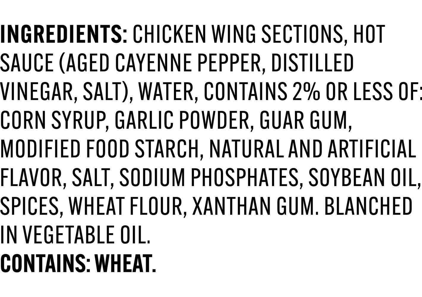 Ingredients: Chicken Wing Sections, Hot Sauce (Aged Cayenne Pepper, Distilled Vinegar, Salt), Water, Contains 2% Or Less Of: Corn Syrup, Garlic Powder, Guar Gum, Modified Food Starch, Natural And Artificial Flavor, Salt, Sodium Phosphates, Soybean Oil, Spices, Wheat Flour, Xanthan Gum. Blanched in Vegetable Oil. Contains: Wheat