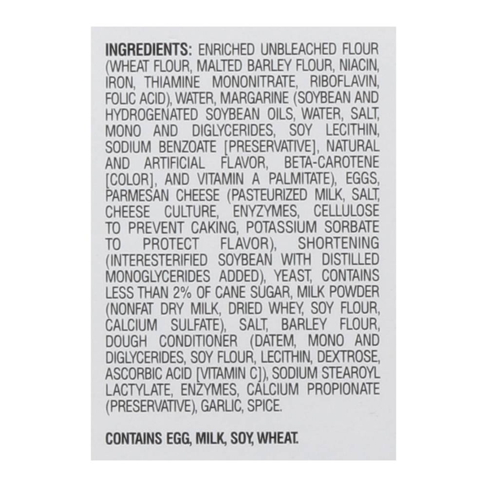 Ingredients: Enriched Unbleached Flour (Wheat Flour, Malted Barley Flour, Niacin, Iron, Thiamine Mononitrate, Riboflavin, Folic Acid), Water, Margarine (Soybean and Hydrogenated Soybean Oils, Water, Salt, Mono and Diglycerides, Soy Lecithin, Sodium Benzoate [Preservative], Natural and Artificial Flavor, Beta-Carotene [Color], and Vitamin A Palmitate), Eggs, Parmesan Cheese (Pasteurized Milk, Salt, Cheese Culture, Enzymes, Cellulose to Prevent Caking, Potassium Sorbate to Protect Flavor), Shortening (Interesterified Soybean with Distilled Monoglycerides Added), Yeast, Contains Less than 2% of Cane Sugar, Milk Powder (Nonfat Dry Milk, Dried Whey, Soy Flour, Calcium Sulfate), Salt, Barley Flour, Dough Conditioner (DATEM, Mono and Diglycerides, Soy Flour, Lecithin, Dextrose, Ascorbic Acid [Vitamin C]), Sodium Stearoyl Lactylate, Enzymes, Calcium Propionate (Preservative), Garlic, Spice Contains: Eggs, Milk, Soybeans, Wheat, Barley